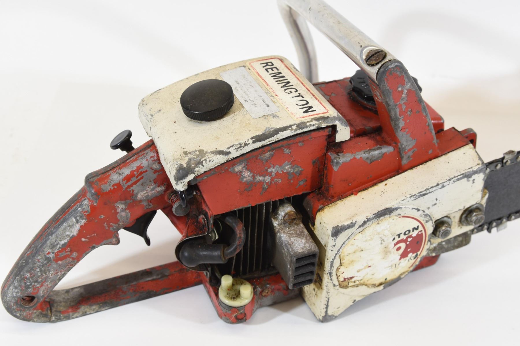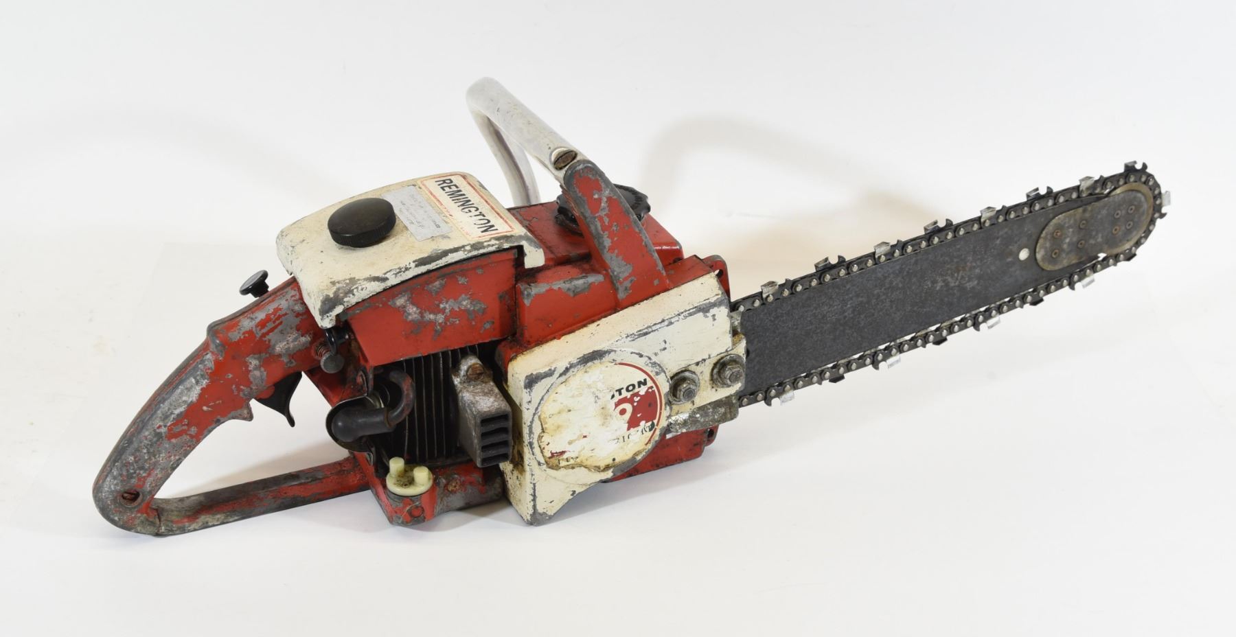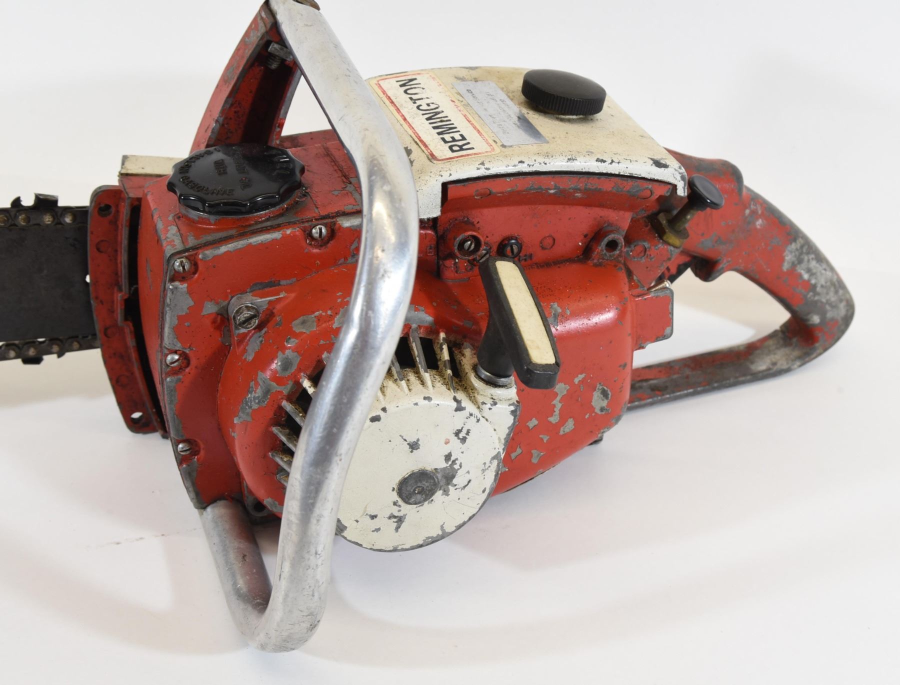 Remington Arms of Canada chain saw. Paint is chipping throughout. Has badge on the underside "Remington Arms of Canada Ltd, Remington, SN 6 07 70 56025, Toronto Ontario Made in Canada". Has 15" bar.