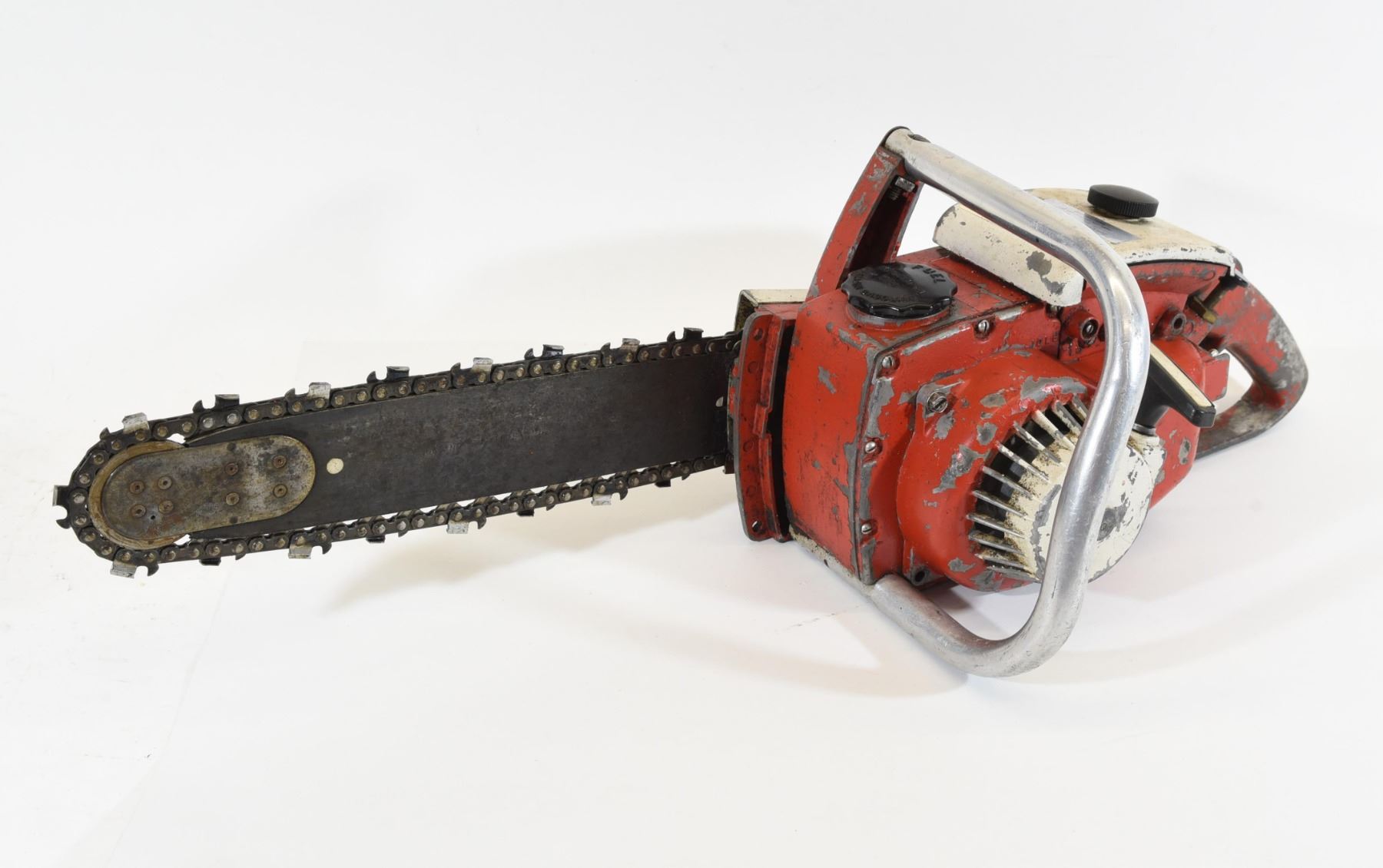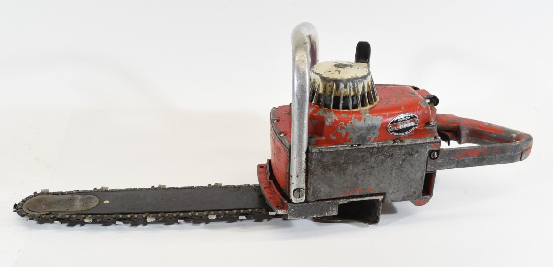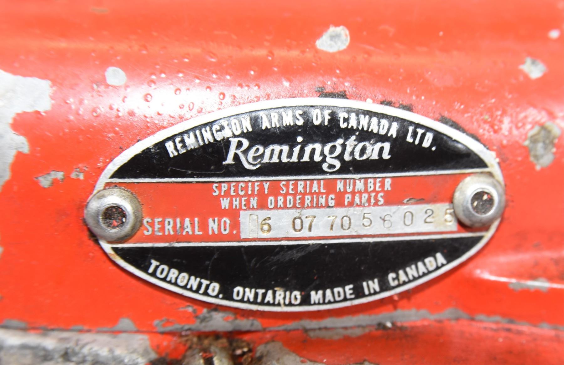 Remington Arms of Canada chain saw. Paint is chipping throughout. Has badge on the underside "Remington Arms of Canada Ltd, Remington, SN 6 07 70 56025, Toronto Ontario Made in Canada". Has 15" bar.