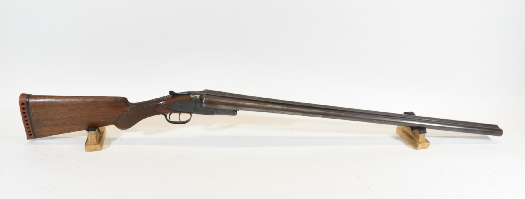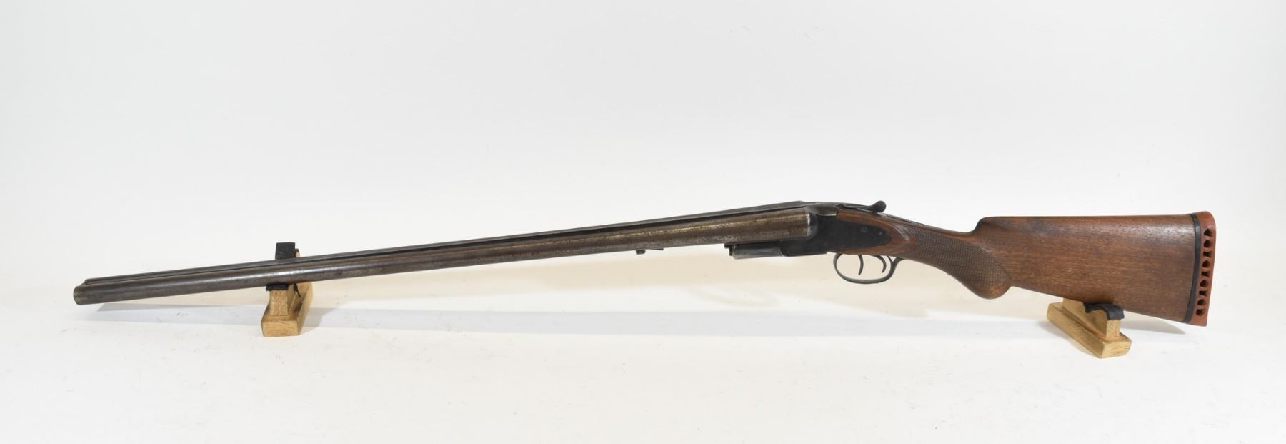 Non-restricted, 12ga, side by side, SN 123 260. Wood stock has many scratches and dents with chips under the action and on either side of the rear grip. The foregrip is missing. Bluing is going grey and has many scratches as well as light rust speckling throughout. Bores are both pitted throughout.