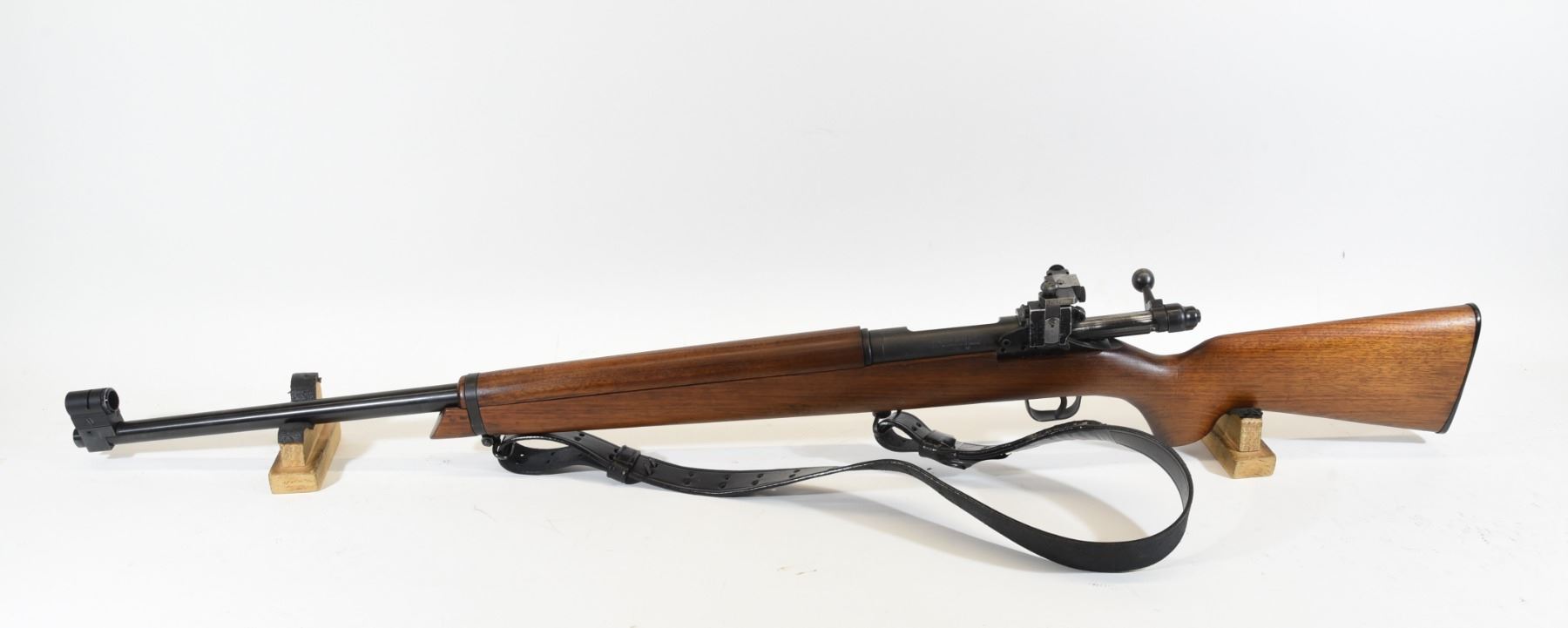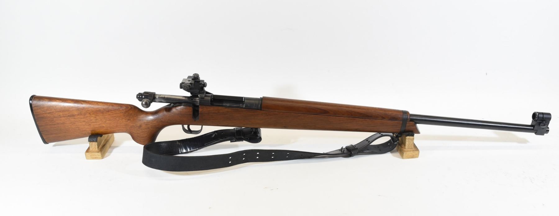 Non-restricted, 7.62, single shot bolt action, SN D154. Wood stock has several scratches and dents but is good overall, bluing has a few scratches and two small patches of surface rust on the action but is good overall. Bore is good. Has black leather shoulder strap and aperture target sight.