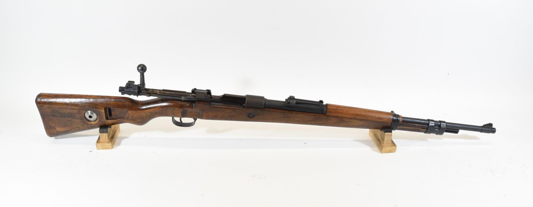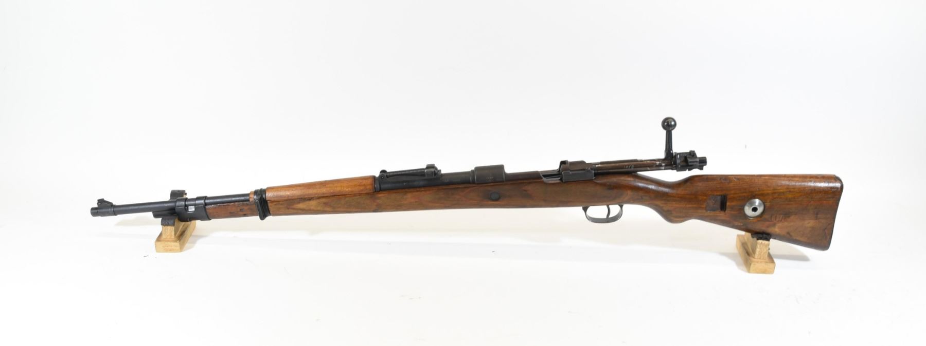 Non-restricted, bolt action, 8 mm Mauser cal., 24" barrel, SN 1108. Wood stock has multiple bruises, scratches, and dents. Bluing is turning grey. Rifling is visible, but poor. Said to be a Russian capture rifle.