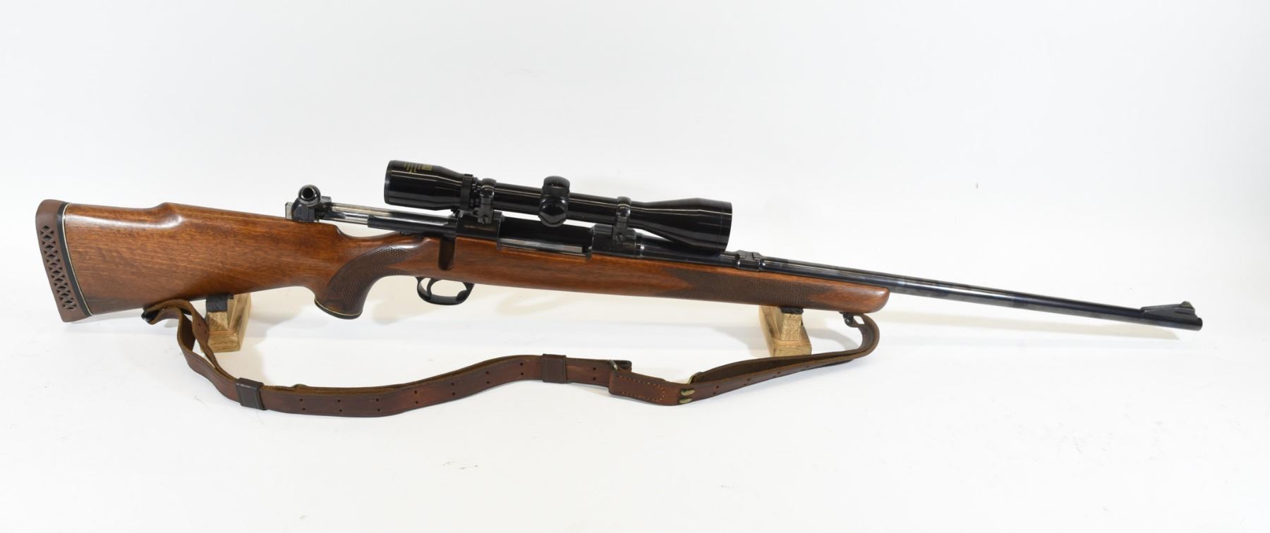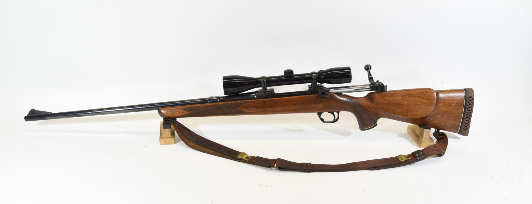 Non-restricted, 30-06SPRG, bolt action, SN 7B1174. Wood stock is in good condition, bluing is in good condition aside from one small scratch. Bore is good. Comes with Bell 4x40 wide scope and leather shoulder strap.
