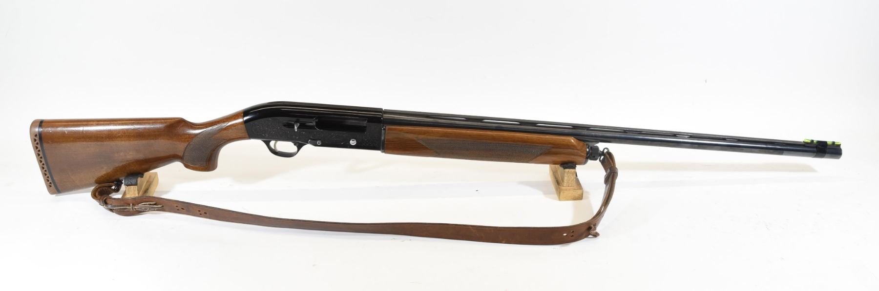 Non-restricted, Semi auto. 12ga 3", fixed full choke, 29" barrel, SN H01990E. Wood stock has several scratches and dents, bluing on barrel is slightly grey and front sight held on with tape. Bluing on receiver is good. Receiver has scroll work. Bore is good. Includes leather sling.