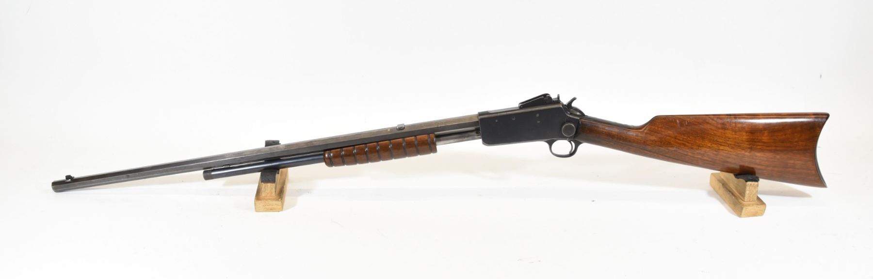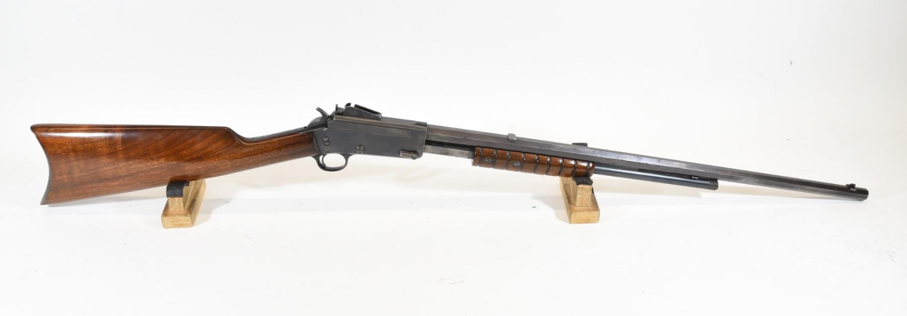 Non-restricted, pump action, 25-20 M, 24" octagonal barrel, SN none. Wood has some light marks, bluing is turning grey with some surface rust. Bore is good. Missing back sight has a peep sight but is missing some parts.