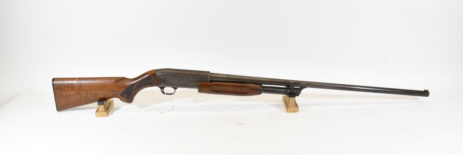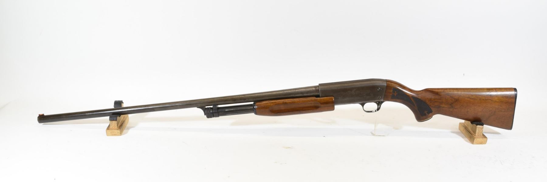 Non-restricted, 12ga 2 3/4", pump action, 29.5" fixed full choke barrel, SN 371089385. Wood stock has many dents and scratches but no cracks, bluing going brown and grey with a couple scratches. Bore is good.