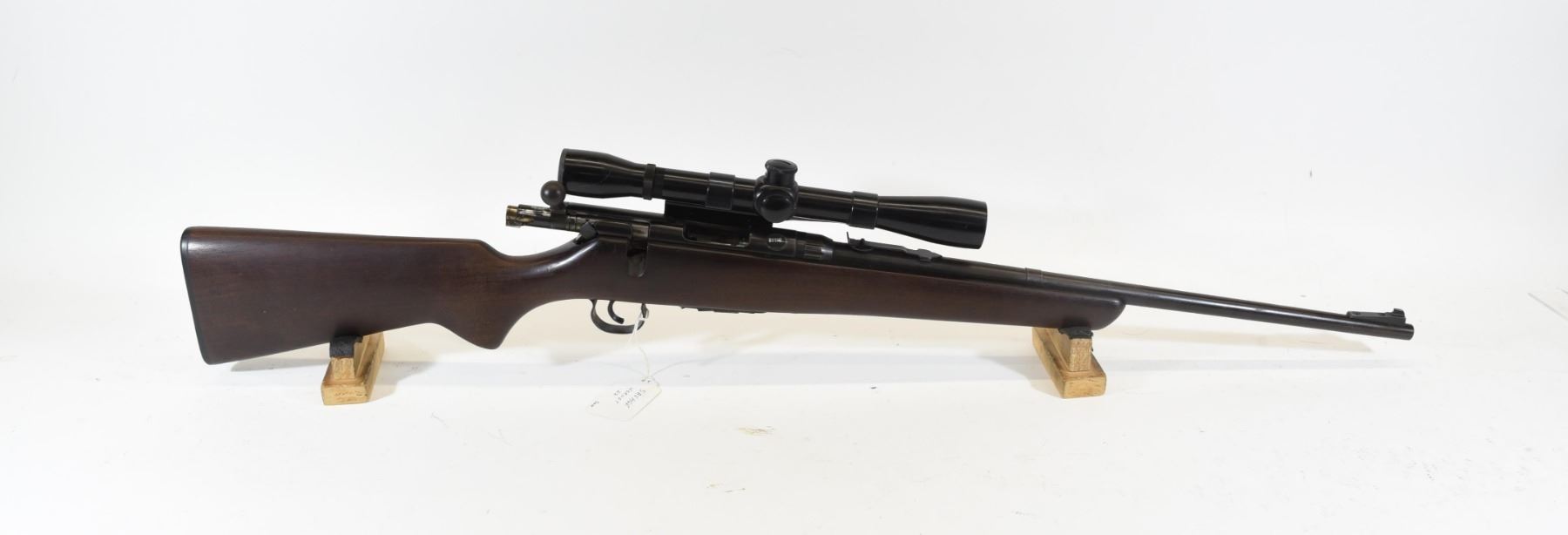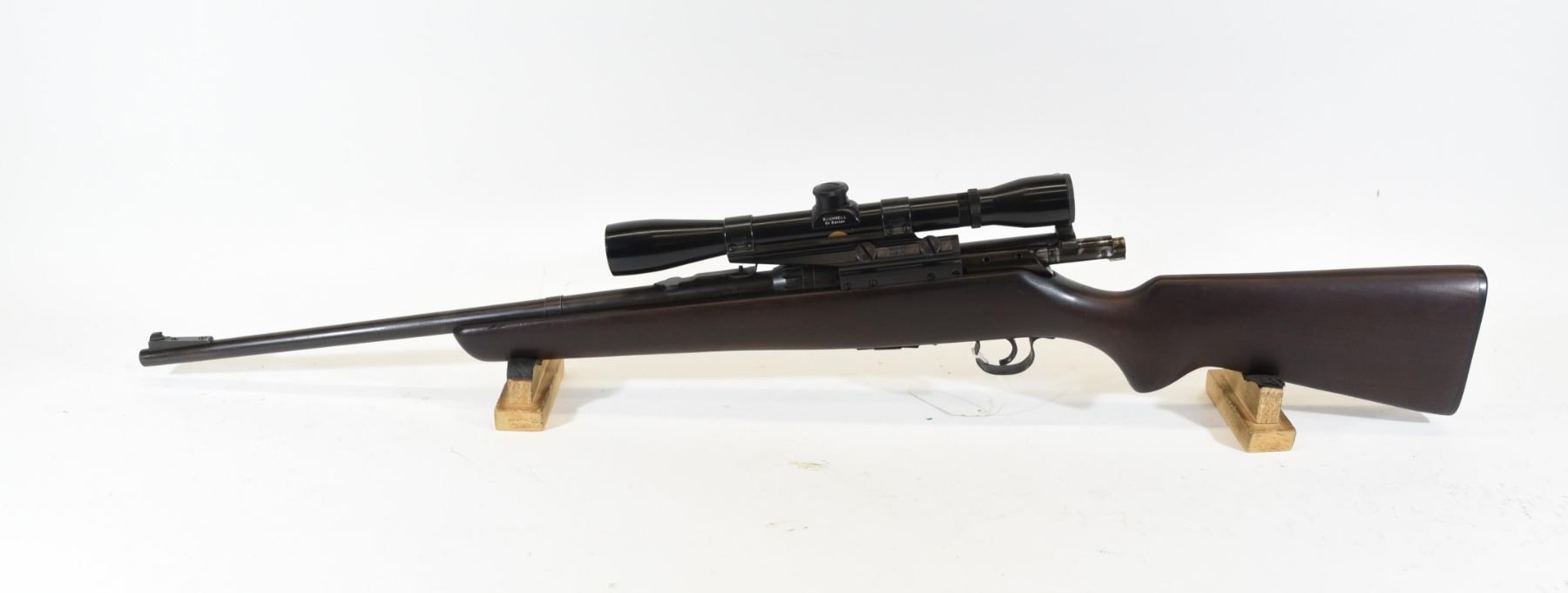 Non-restricted, 22Hornet, bolt action, SN 6111142. Wood stock has several scratches and one chip on the left side of the barrel but is good overall, bluing has a few small scratches and is beginning to turn brown. Bore is excellent. Rifle has a Bushnell 6X Banner scope.