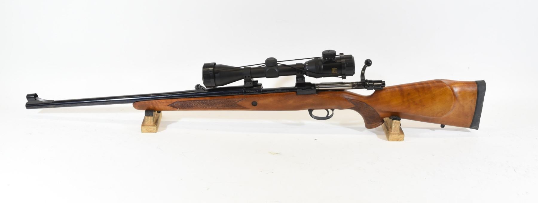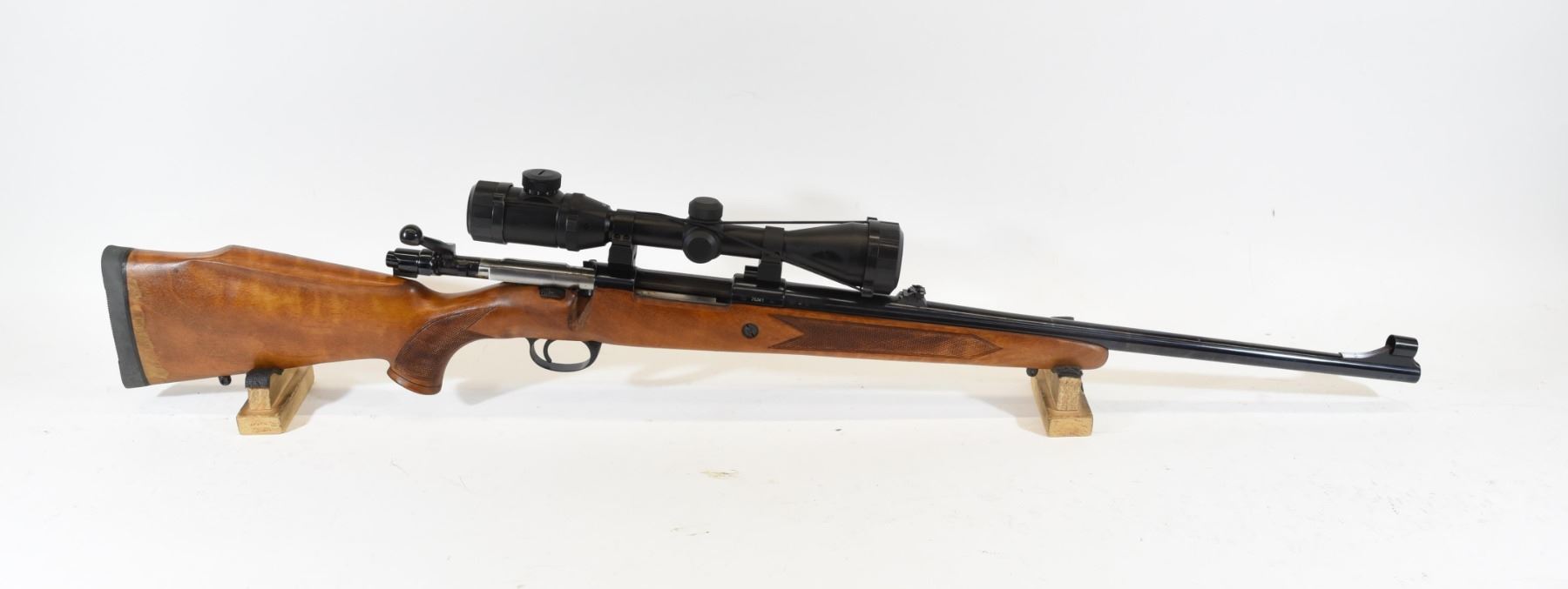 Non-restricted, 375H&H Mag, bolt action, SN 75341. Wood stock is in good condition, bluing has a few small scratches and one speckle of rust. Bore is good. Rifle has Bell 2.5-10x44CE scope.