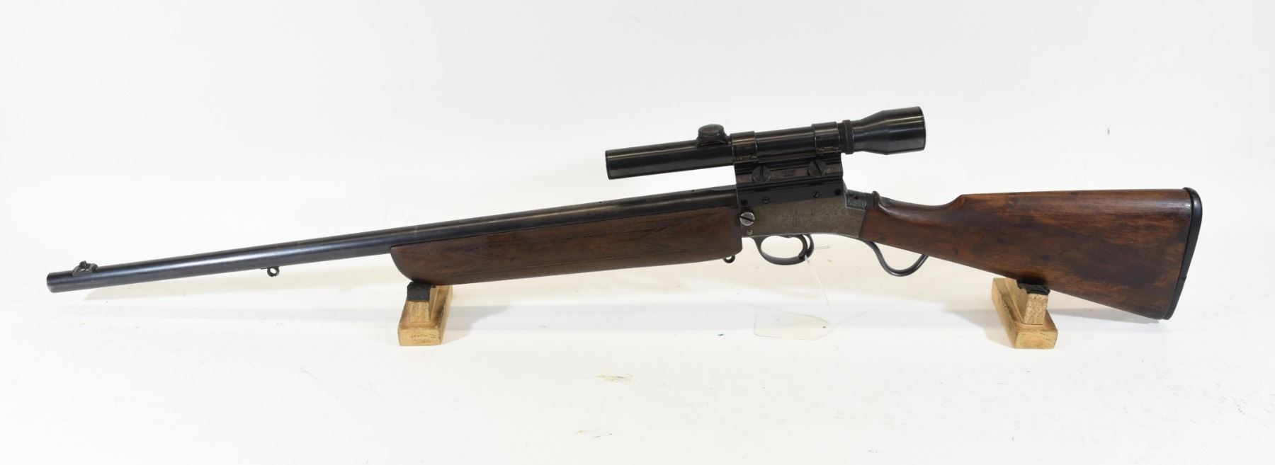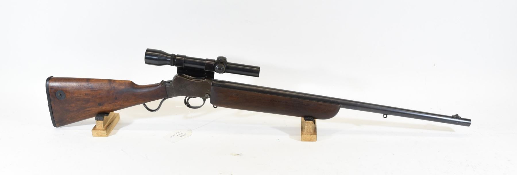 Non-restricted, 218B, single shot, SN 34885. Wood stock has many dents and scratches but no cracks, bluing is going brown and has several light scratches. Bore is excellent. Rifle was originally 220LR but was re-chambered to 218B. Rifle has an unknown scope mounted.