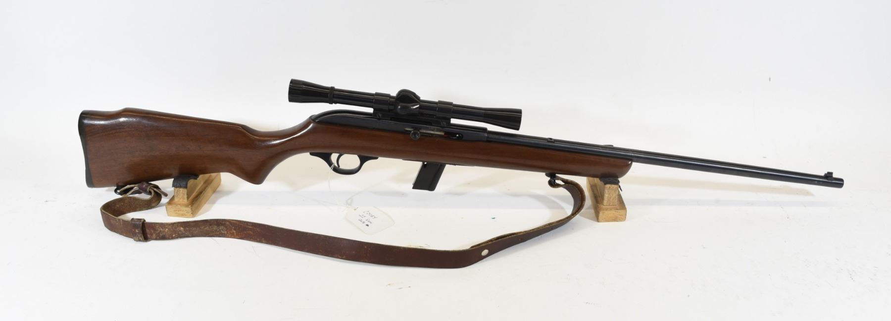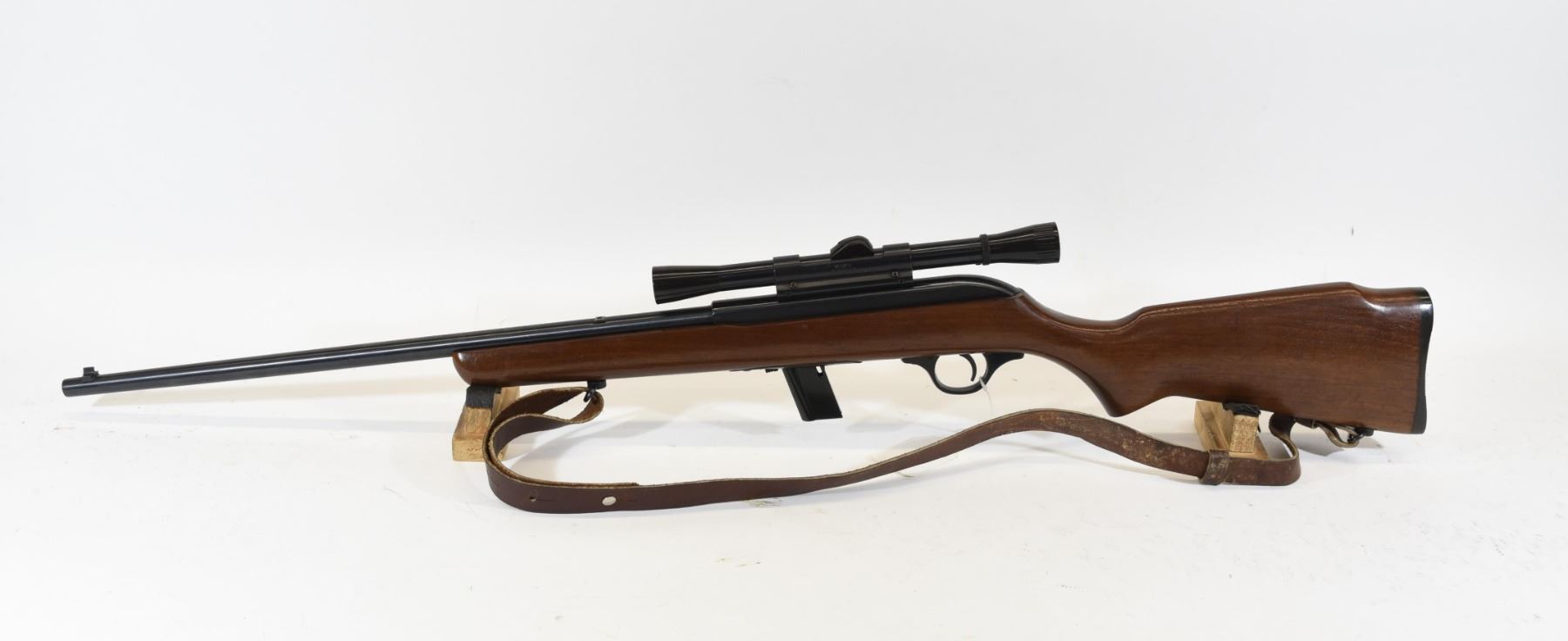 Non-restricted, 22LR, semi-auto, SN N/A. Wood stock has several scratches but is in good condition. Bluing has a few light scratches one bare patch and one spot of rust on the action. Bore is excellent. Rifle has a Weaver C4 scope mounted and a leather shoulder sling.