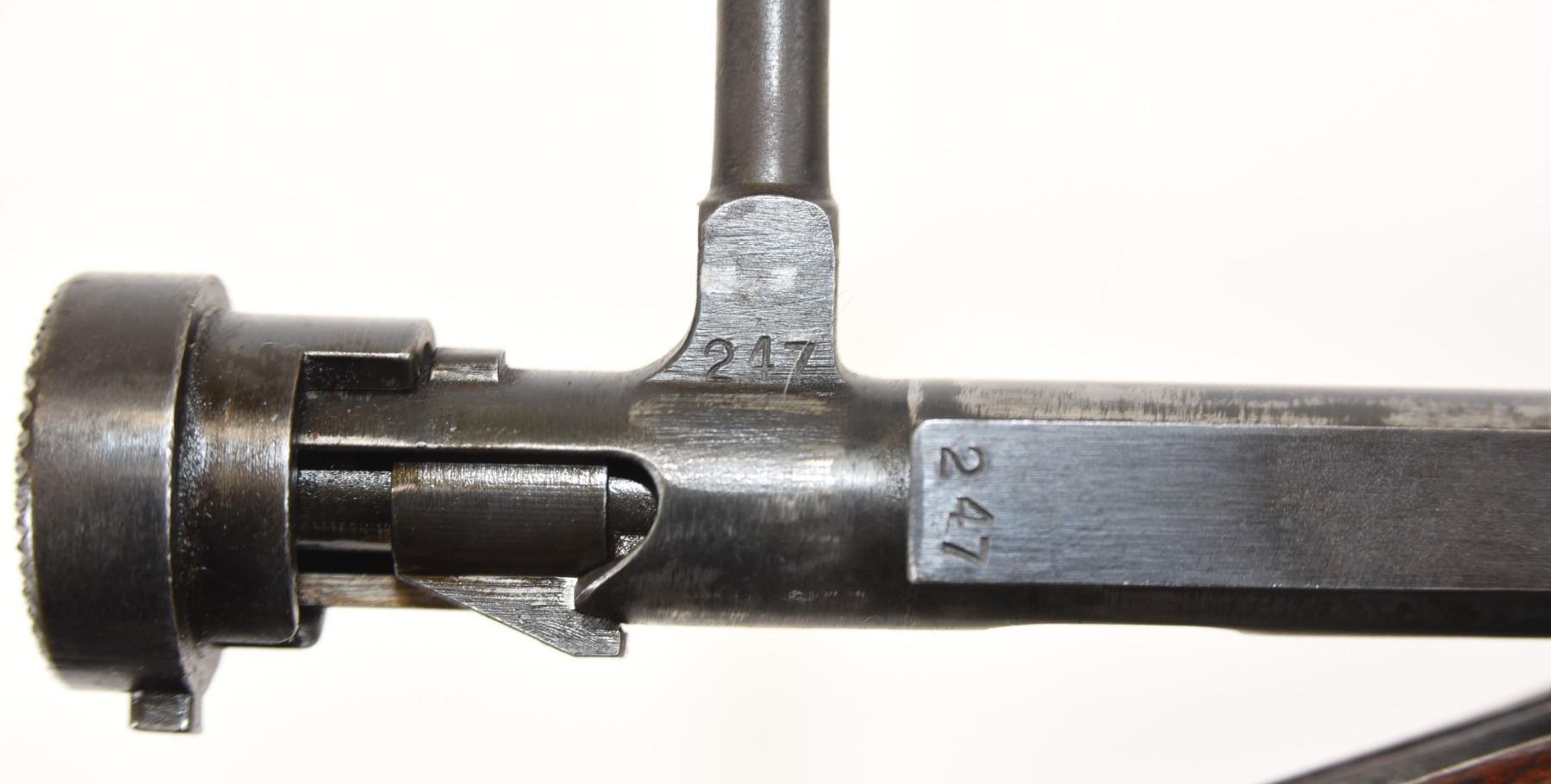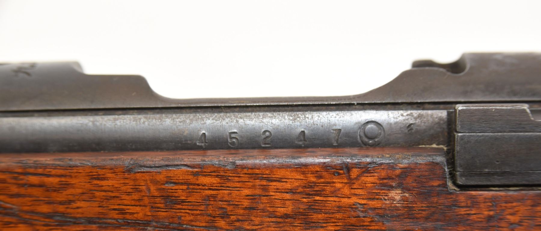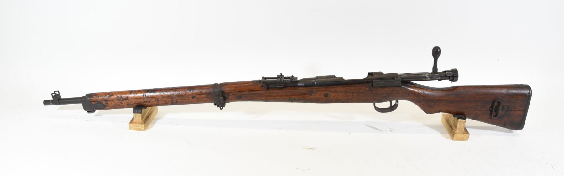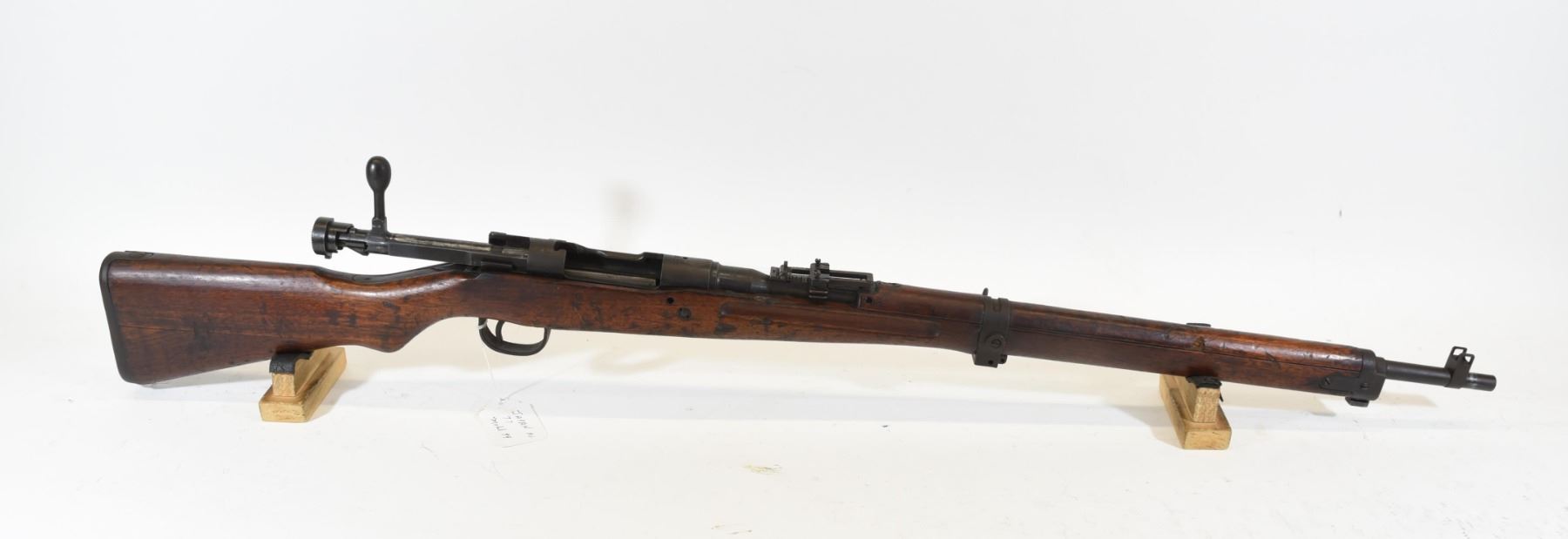 Non-restricted, 7.7x58, bolt action, SN 45247. Wood stock has many dents scratches and chips but no cracks. Bluing is going brown and beginning to rust with many scratches. Bore is excellent with prominent shiny rifling. Bolt has matching serial number "247". Chrysanthemum has been removed.