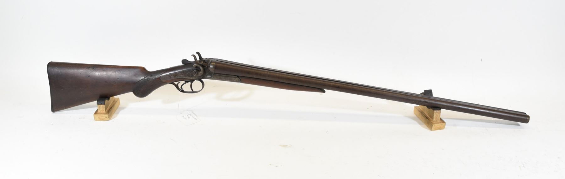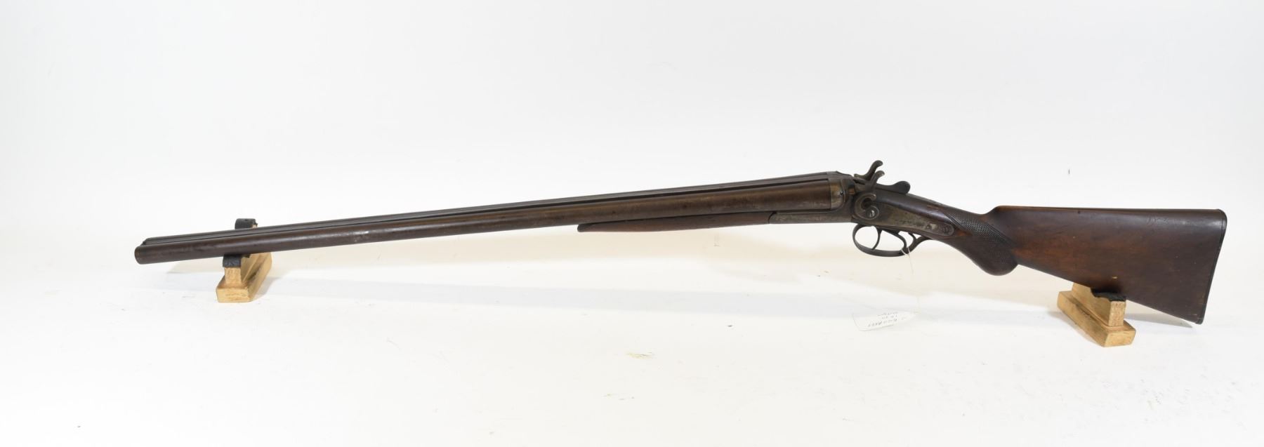 Non-restricted, 12ga, side x side, 30" Damascus barrels, SN 528655. Wood stock has many scratches and dents with cracks through the upper and lower tangs. Bluing has gone brown. Bores are both pitted throughout.