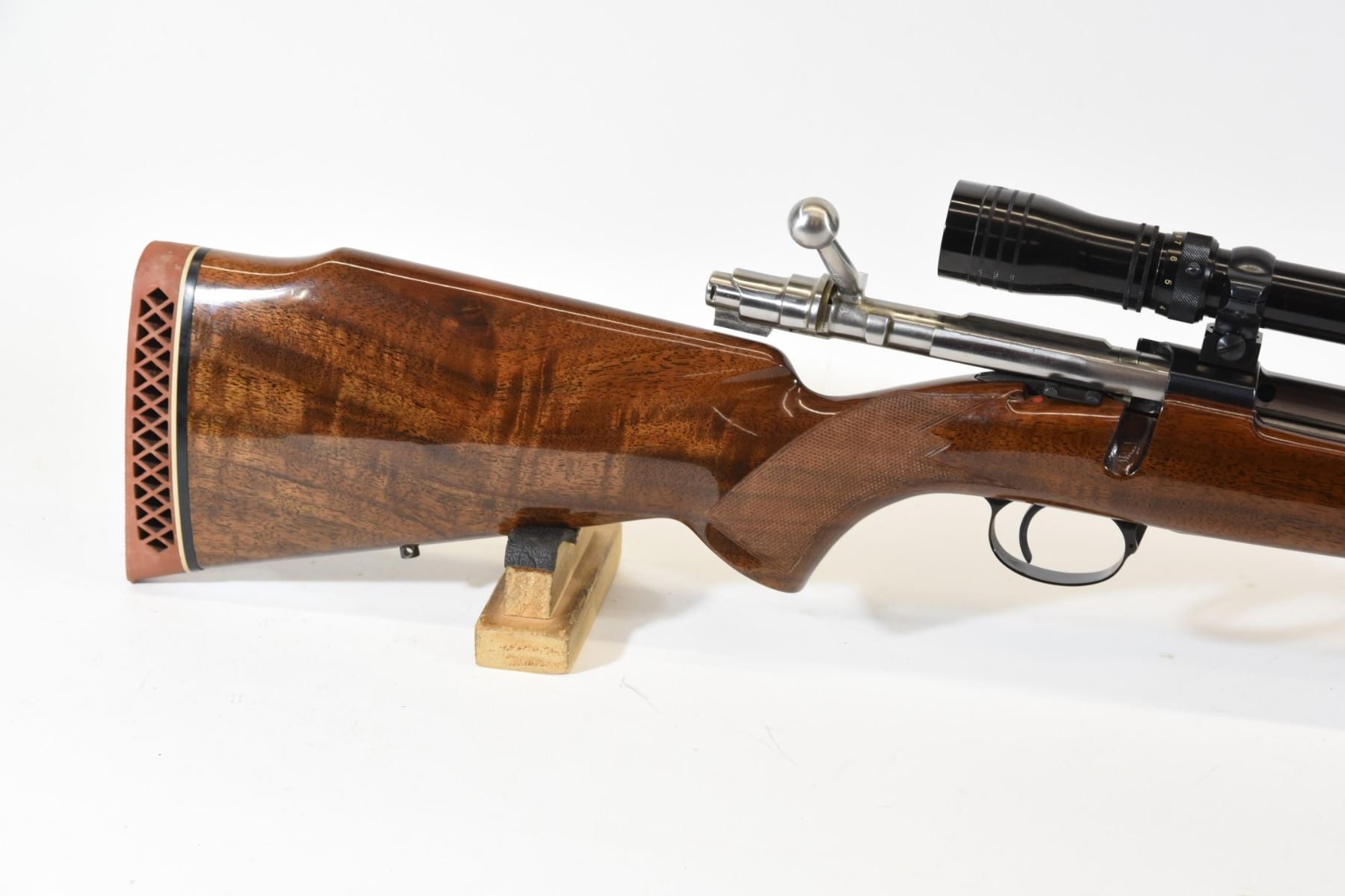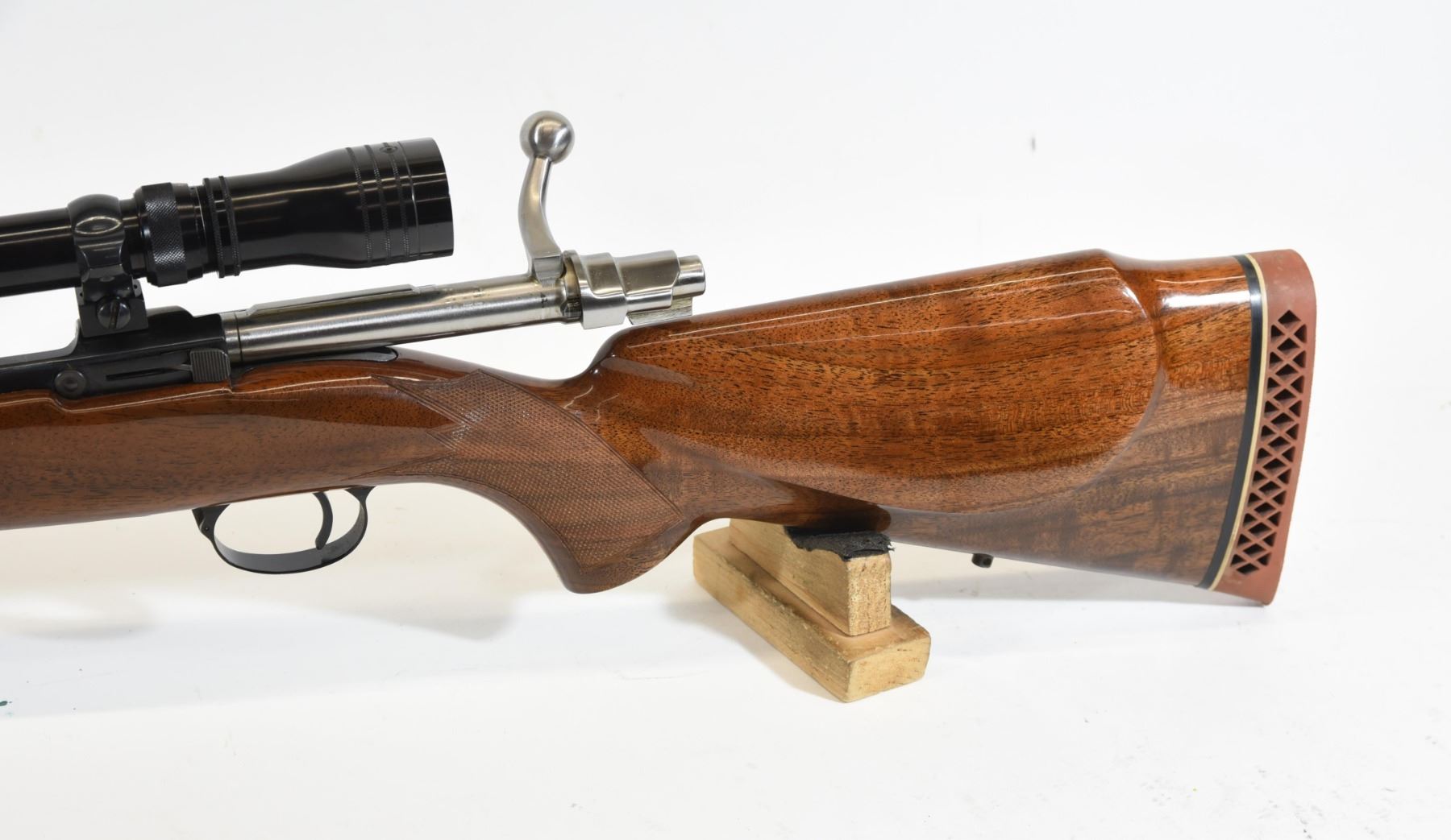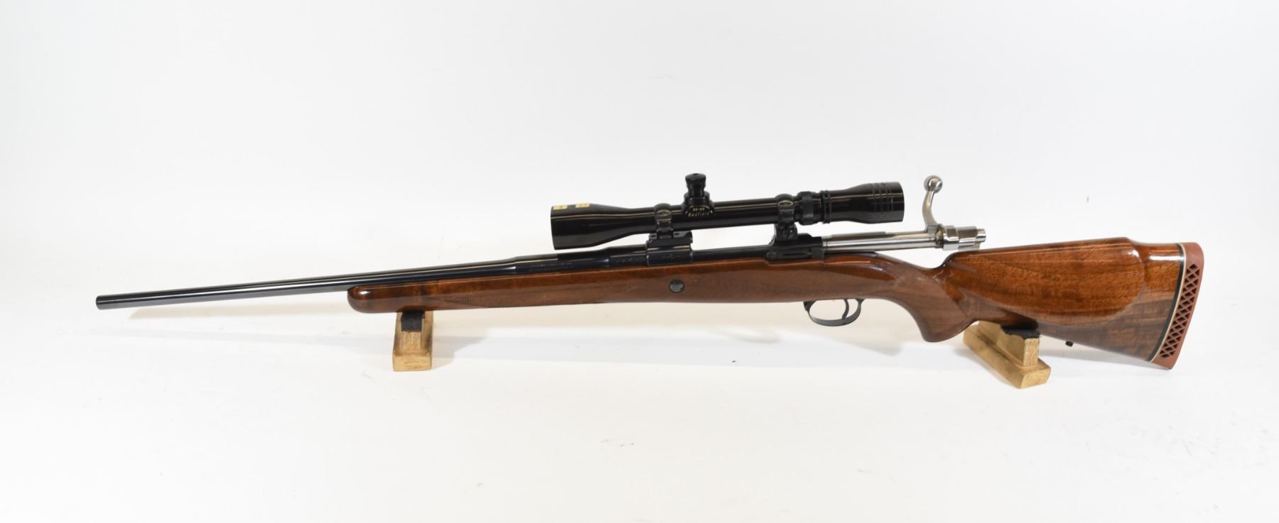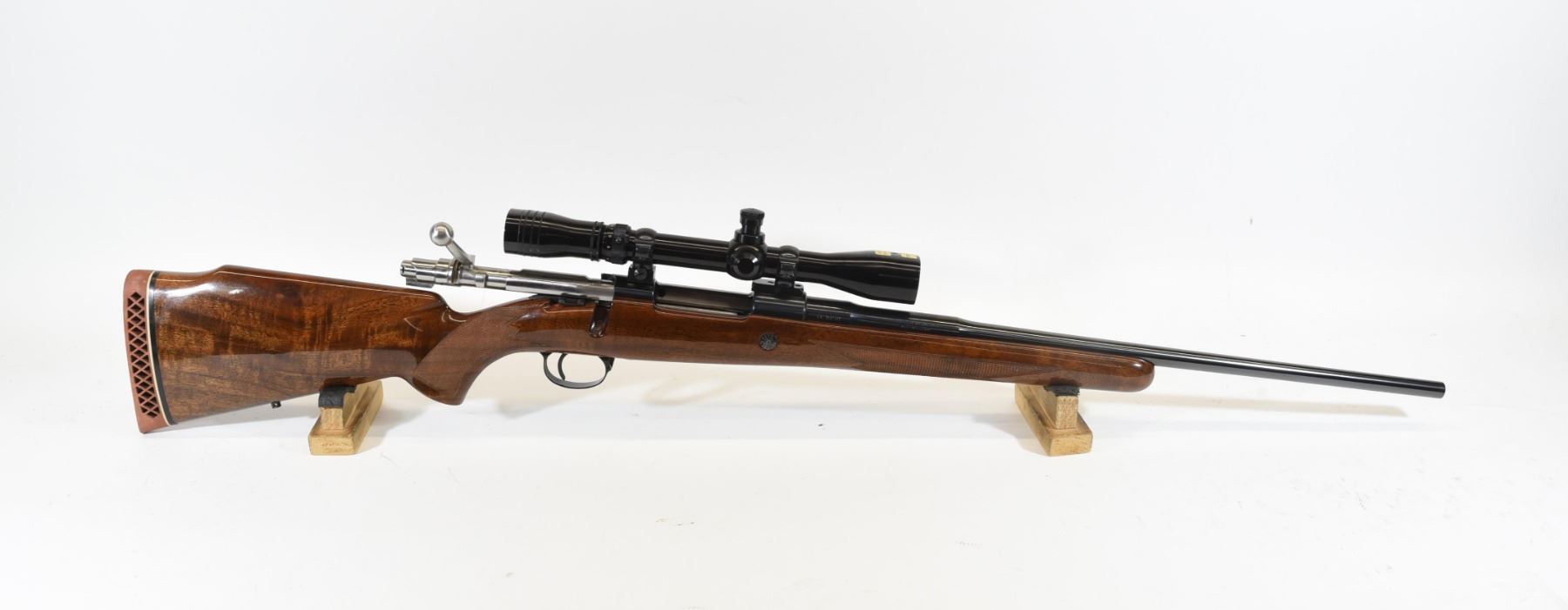 Non-restricted, bolt action, 264 Win. Mag., 22" light barrel, SN 3L 18291. Wood is near excellent with a couple of light dings on the bottom of the butt stock. Bluing is very good. Bore is excellent. Includes a Redfield 4-plex 3x - 9x scope.