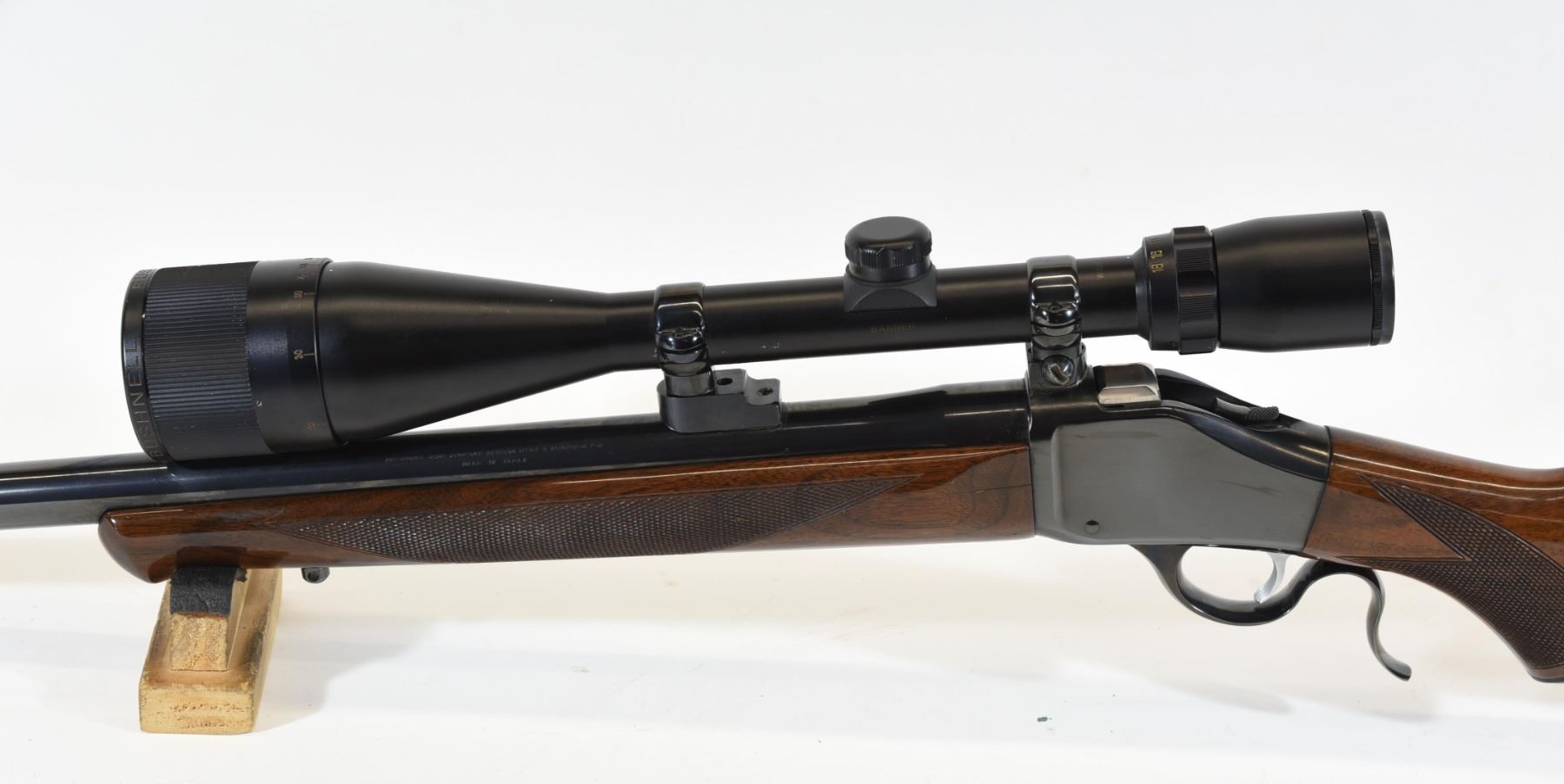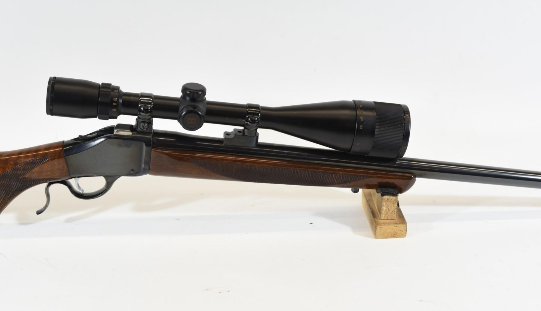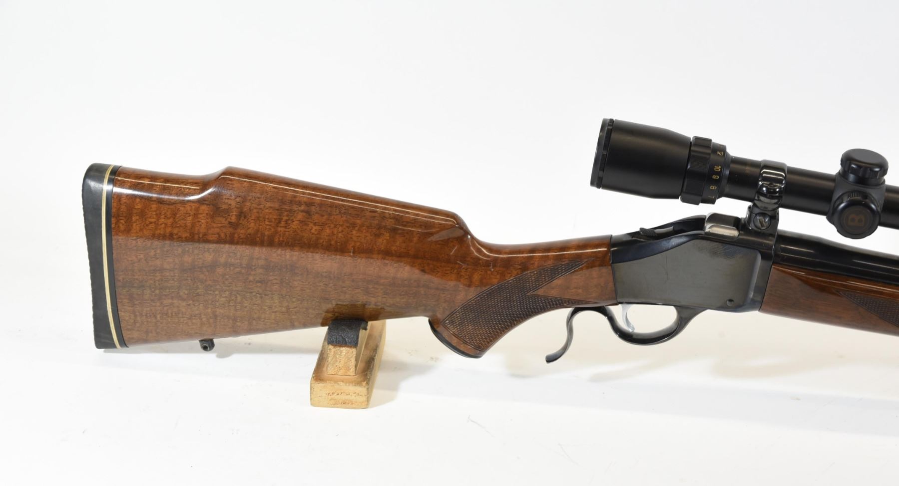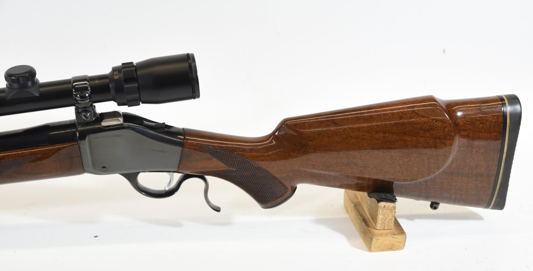 Non-restricted, single shot lever action, 22-250, 26" heavy barrel, SN 01665 RT 147. Wood has a 1" fine crack on left side at receiver. Other than that, wood is in very good condition. Bluing is very good. Bore is excellent. Includes a Bushnell Banner 6 x18 wide angle scope.