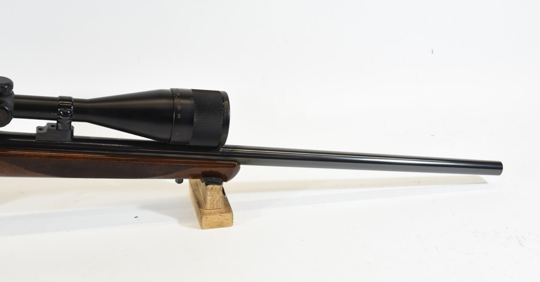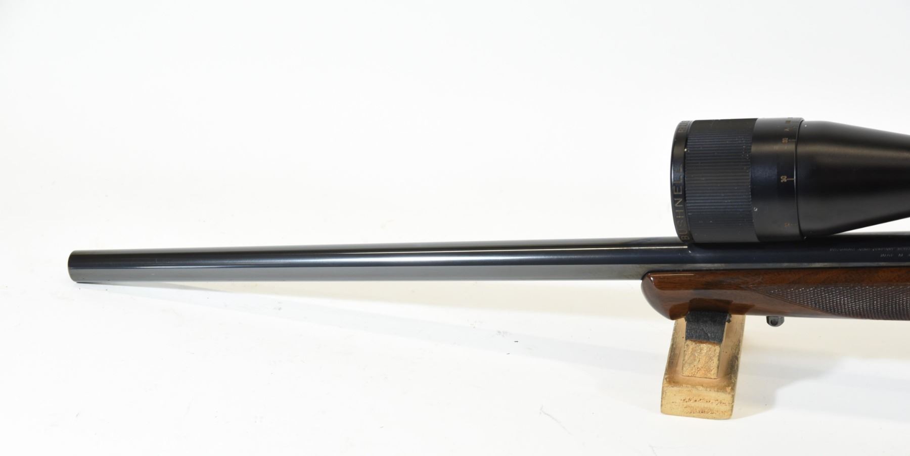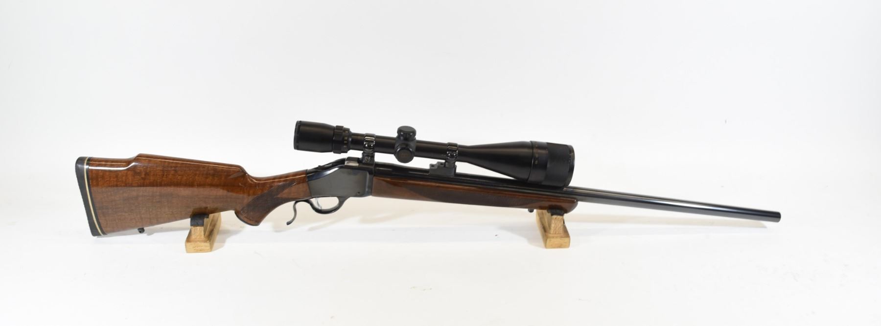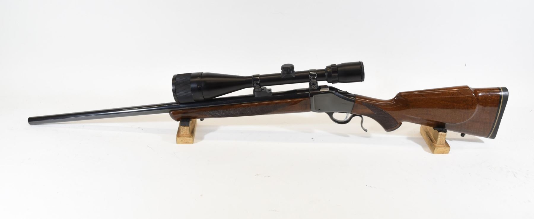 Non-restricted, single shot lever action, 22-250, 26" heavy barrel, SN 01665 RT 147. Wood has a 1" fine crack on left side at receiver. Other than that, wood is in very good condition. Bluing is very good. Bore is excellent. Includes a Bushnell Banner 6 x18 wide angle scope.