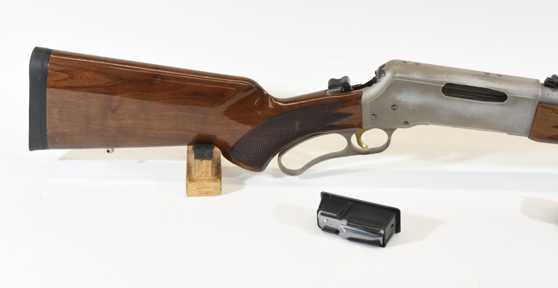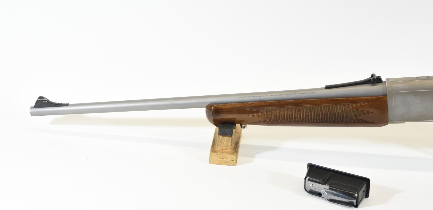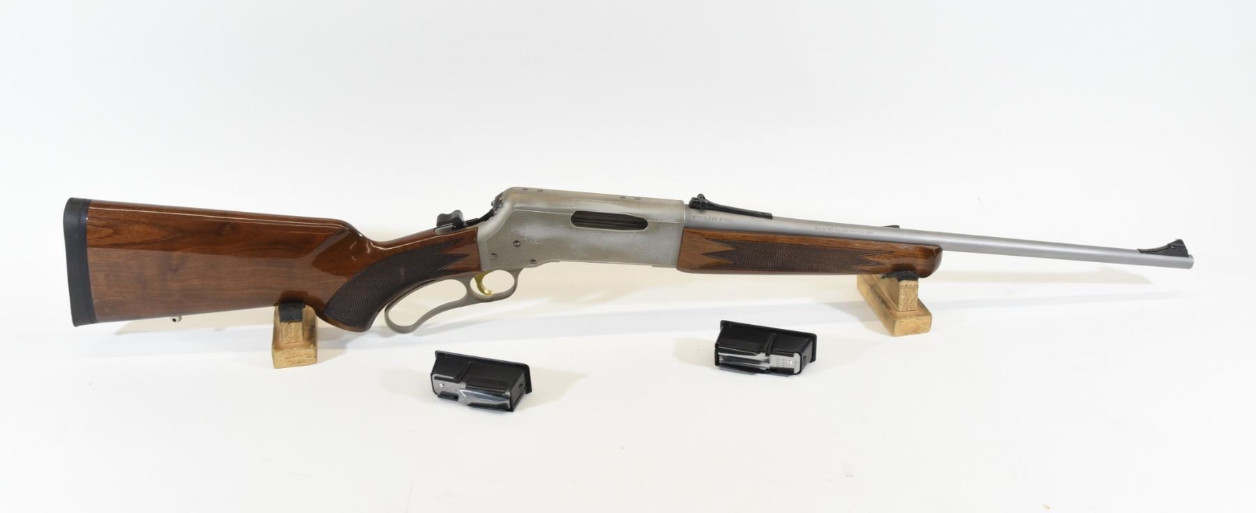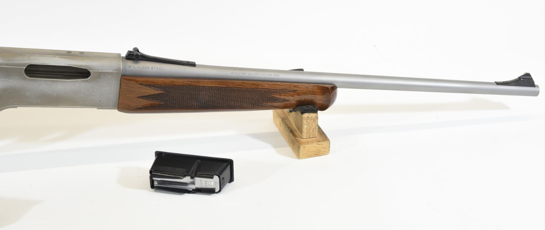 Non-restricted, 243Win, 19.5" matte stainless finish barrel, SN 02931ZY341. Wood stock is in good condition with only a few very minor marks and one dent in the checkering of the rear grip. Metal finish has one small scratch on the barrel and many scratches and wear marks on the receiver. Bore is good. Comes with an extra mag that has some corrosion on the bottom.