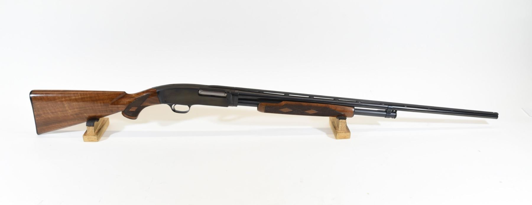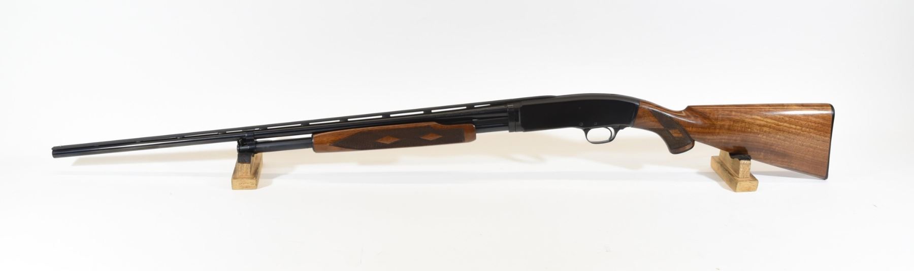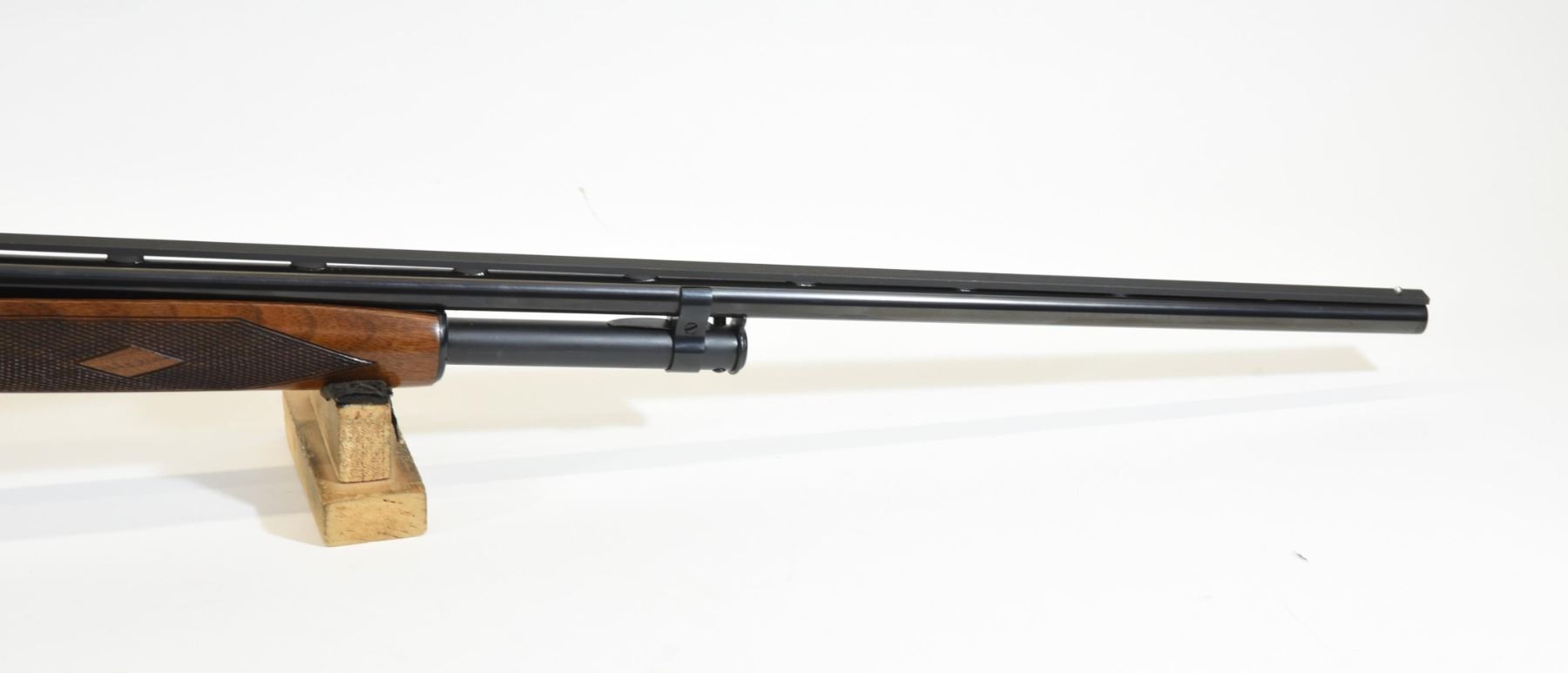 Non-restricted, 410ga 3", 27.5" vent rib fixed full choke barrel, SN 116003. Double diamond wood stock is in very good condition with only a few minor marks and one light scratch in the finish of the butt stock. Bluing is in very good condition aside from several minor marks on the action. Bore is good.