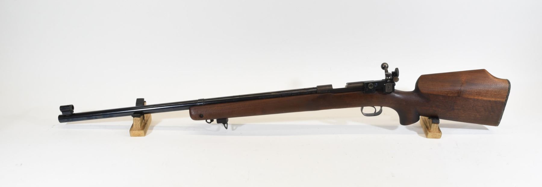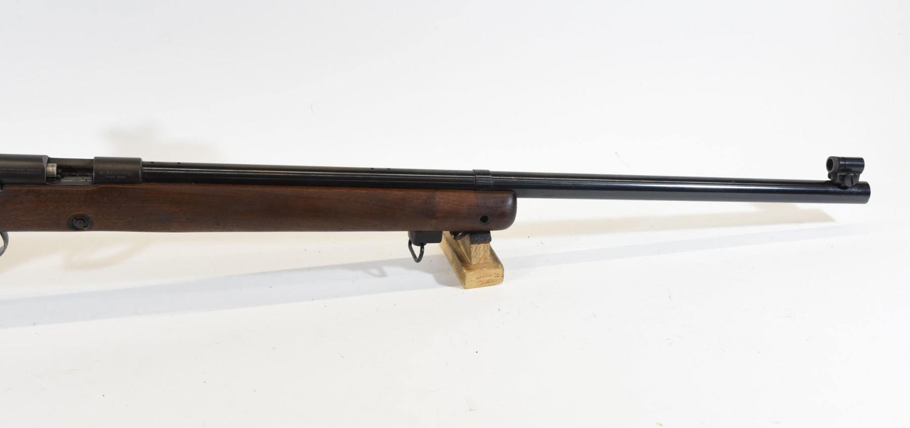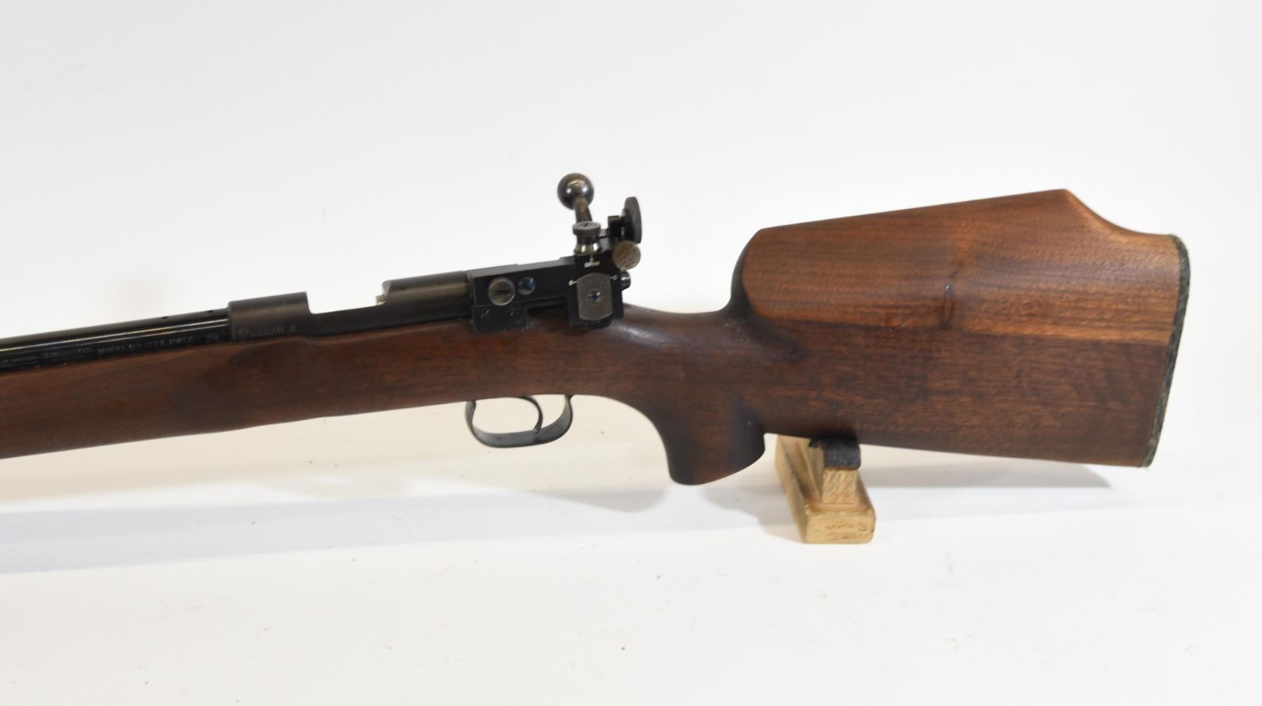 Non-restricted, 22LR, bolt action, SN 64830 B. Custom wood stock has several dents and scratches, but no cracks or chips. Bluing is going brown on the action and there are several small scratches on the barrel, but it is good overall. Bore is excellent. Rifle has a Lyman adjustable aperture sight mounted. Heavy target barrel is drilled and tapped for a scope.