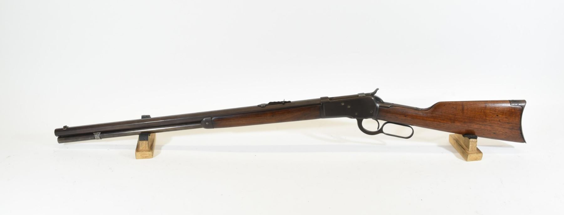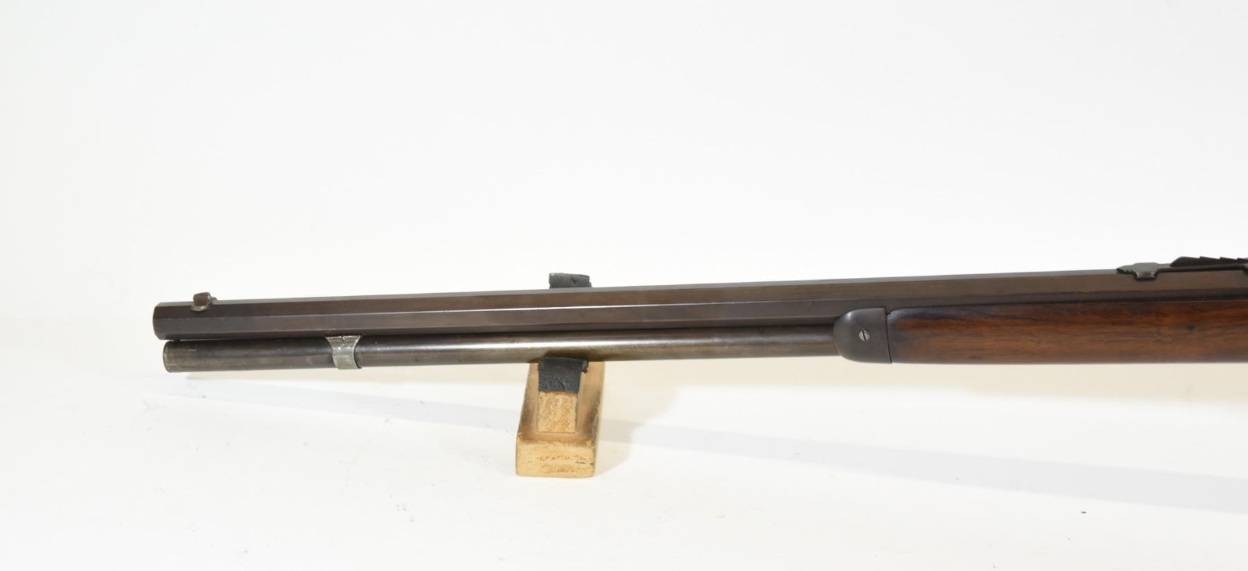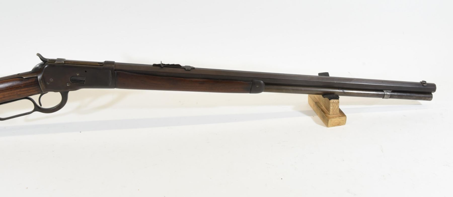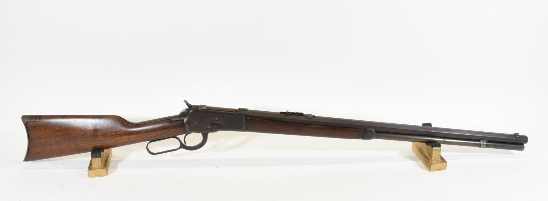 Non-restricted, 44WCF, lever action, 23.5" octagonal barrel, SN 762578. Wood stock has several dents and scratches with one large chip down the right side of the foregrip. Bluing has gone brown with some pitting and a few scratches. Bore has some very light pitting in places but, is excellent otherwise. Rifle has had a hole drilled for a flip-up sight but the sight is missing.