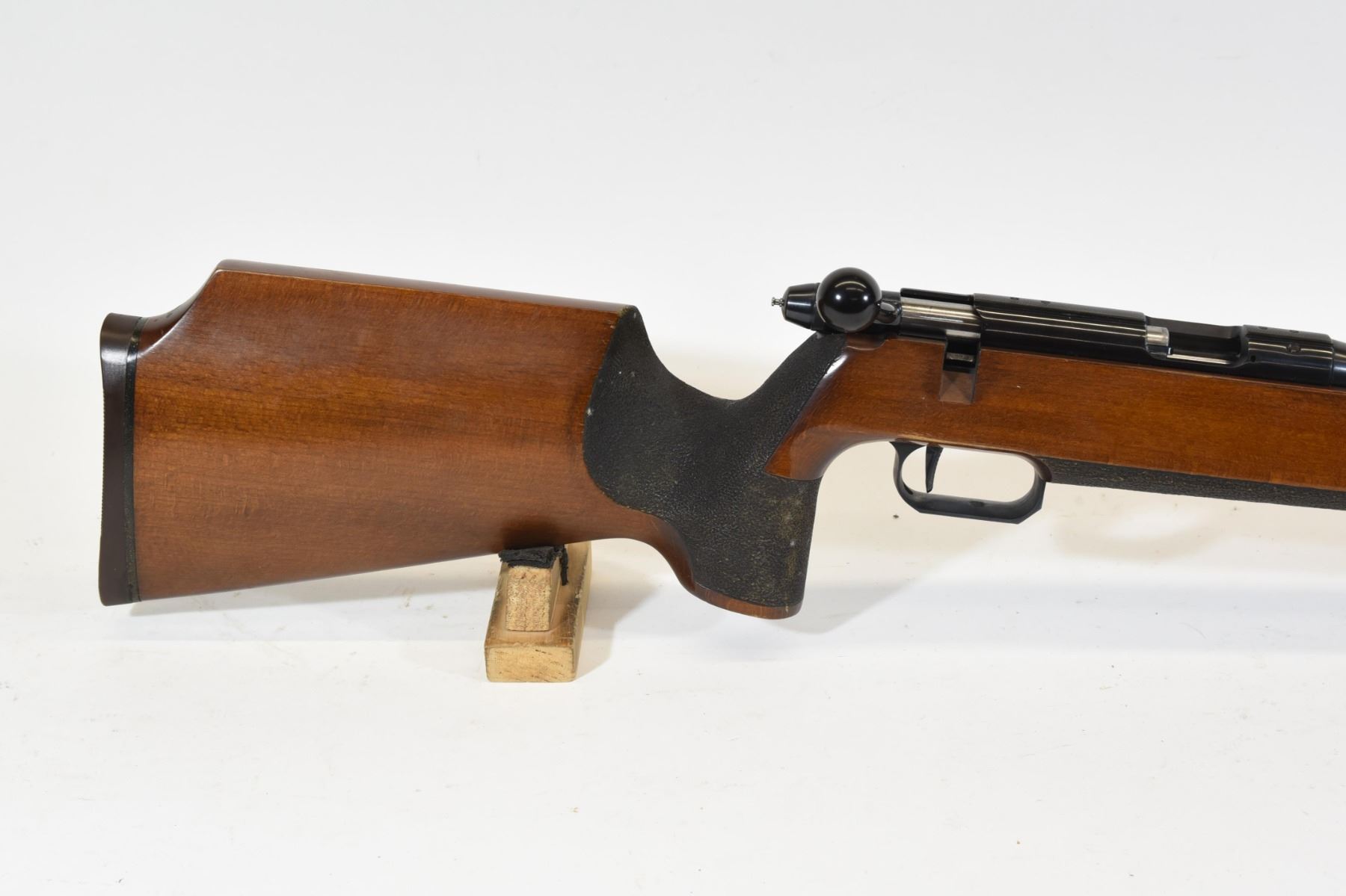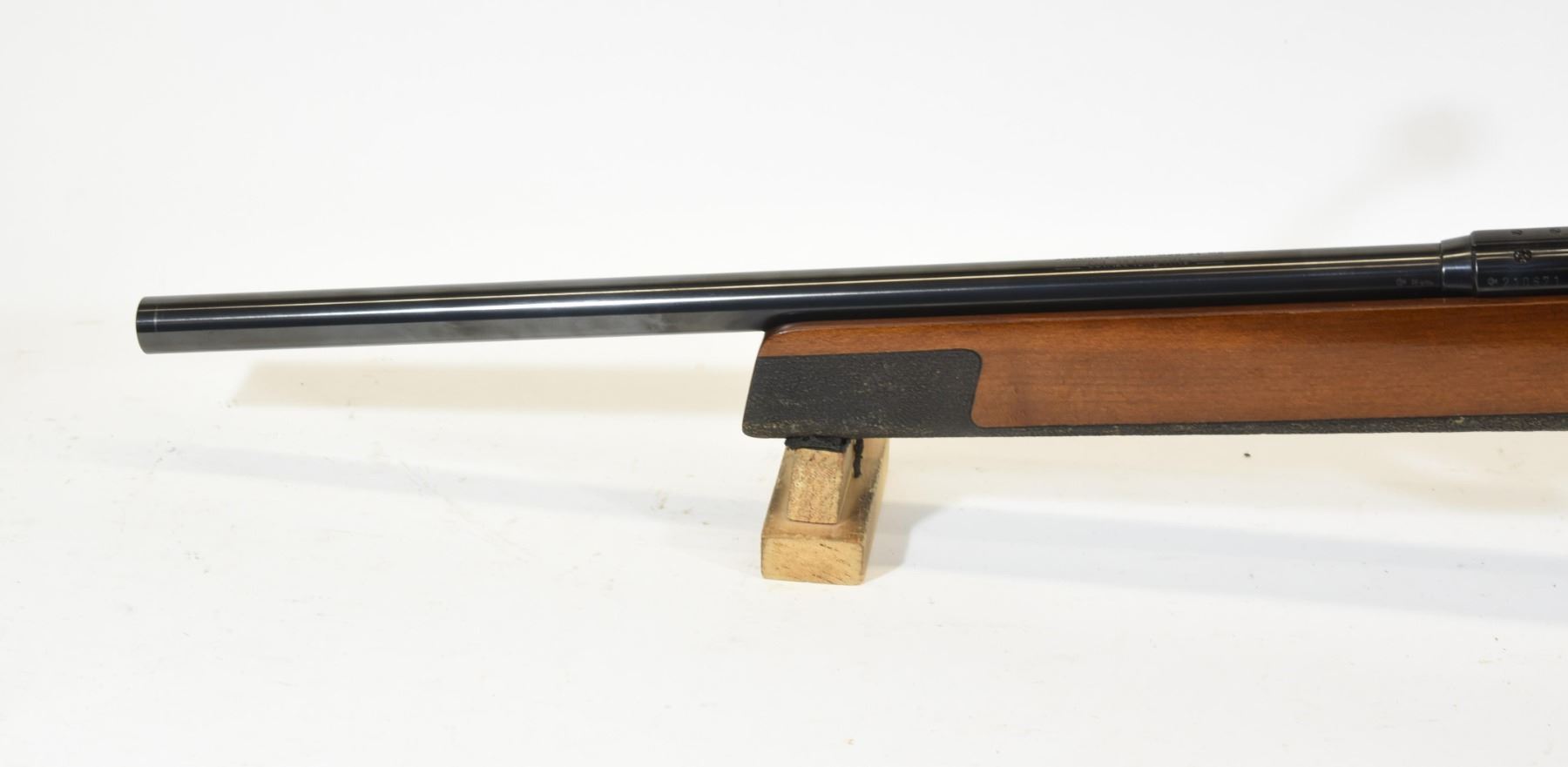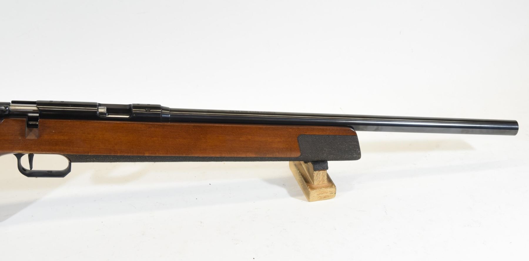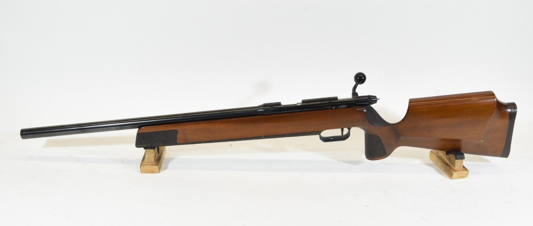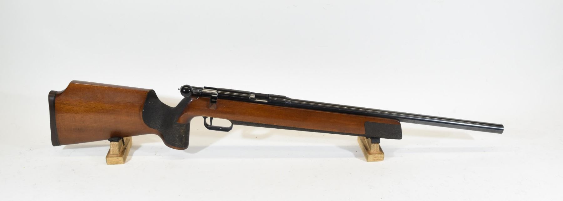 Non-restricted, 22LR, bolt action, 19" target barrel, SN 210671. Wood stock has many small dents and scratches. Bluing is good. Bore is excellent.