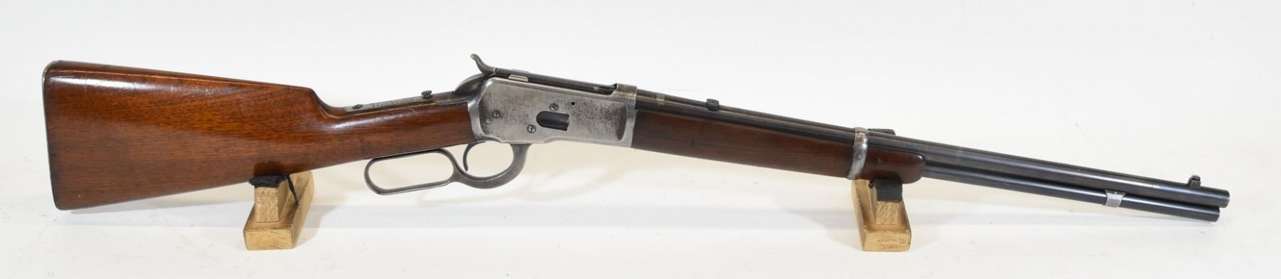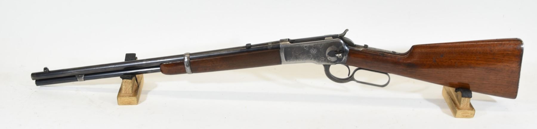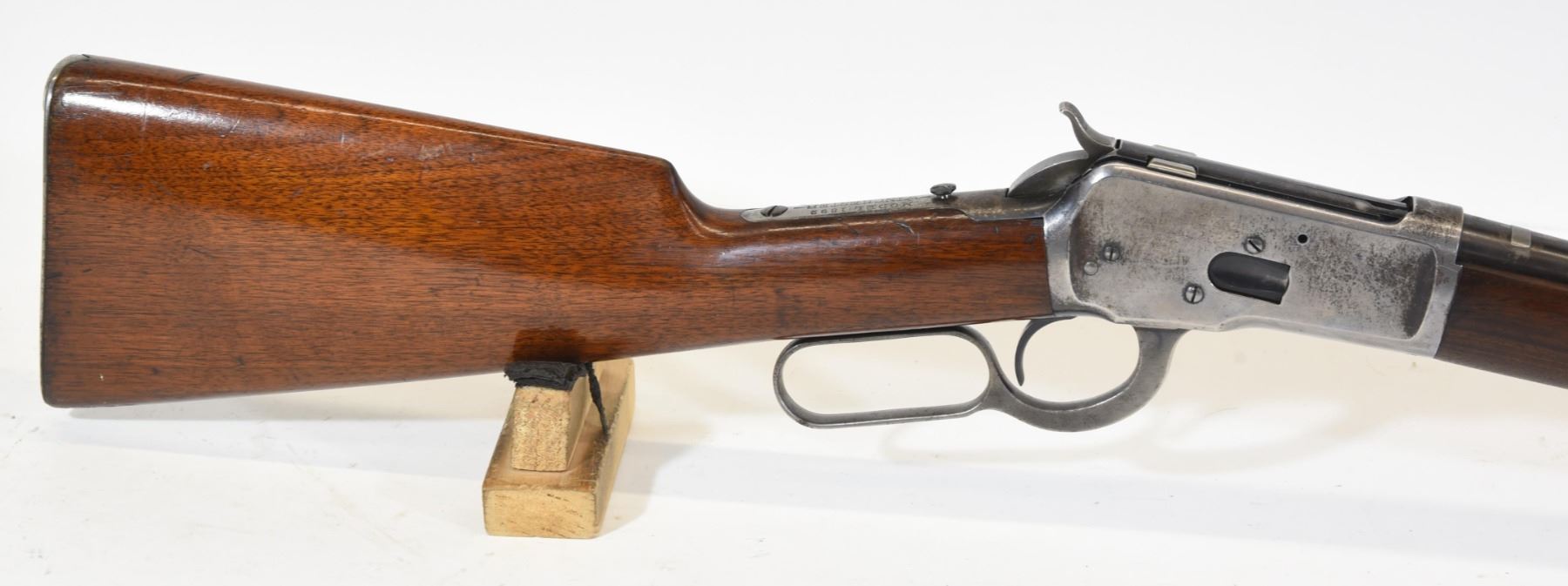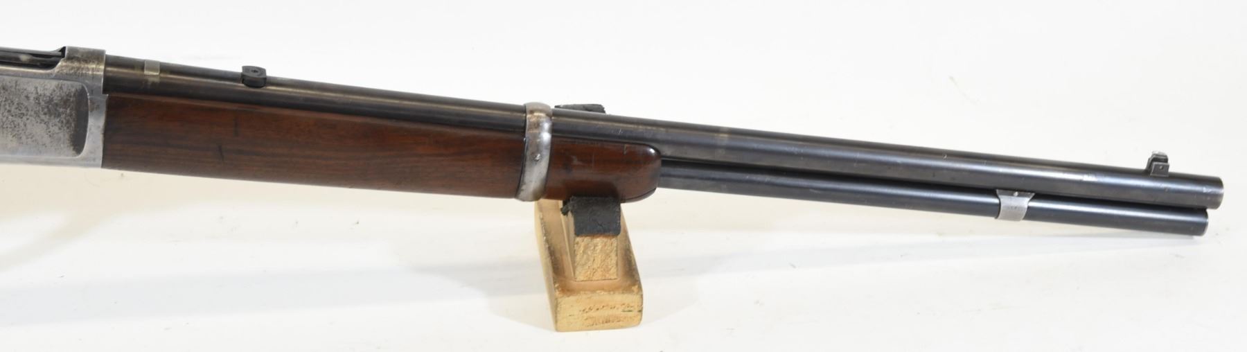 Non-restricted, 25-20WCF, lever action, 19.5" barrel, SN 659006. Wood stock has many dents and scratches, but no cracks or chips and is in good condition considering age. Bluing is going grey and has many scratches. Bore is excellent. Rifle is missing the rear sight and the flip-up sight.