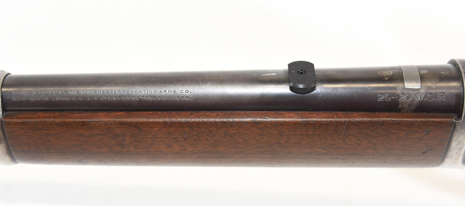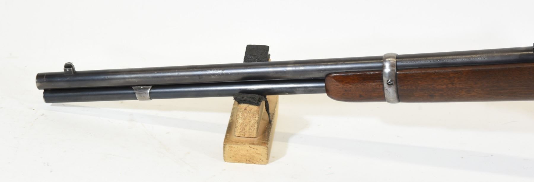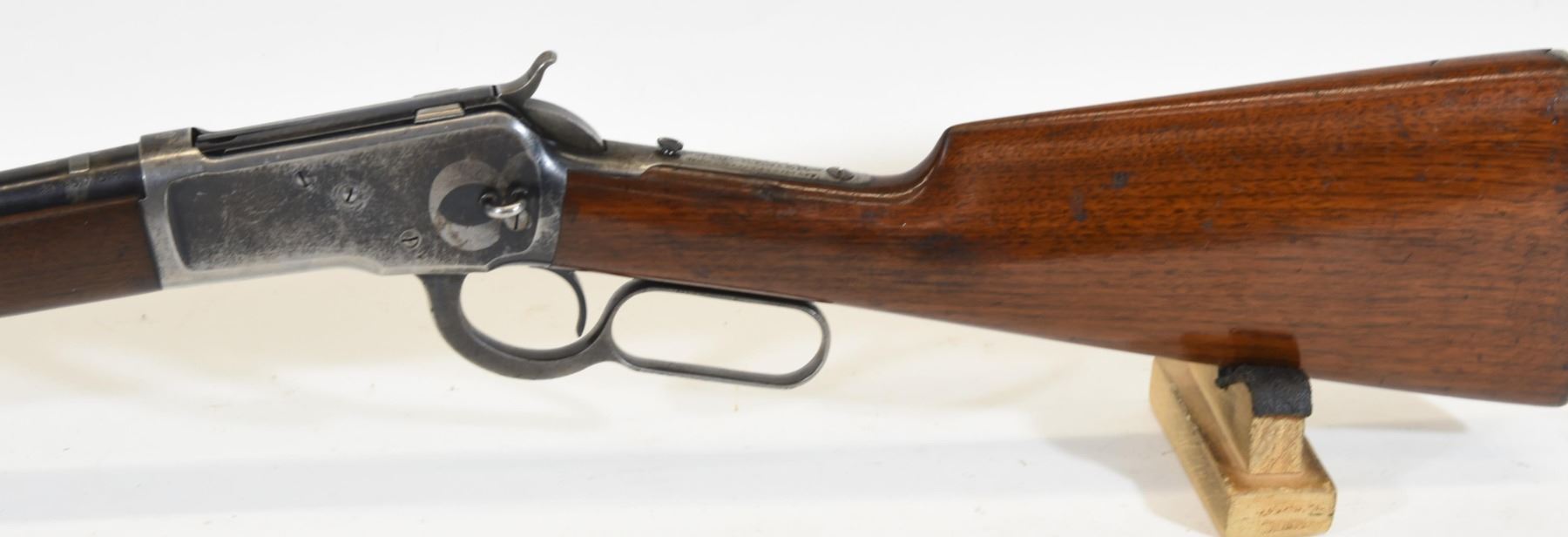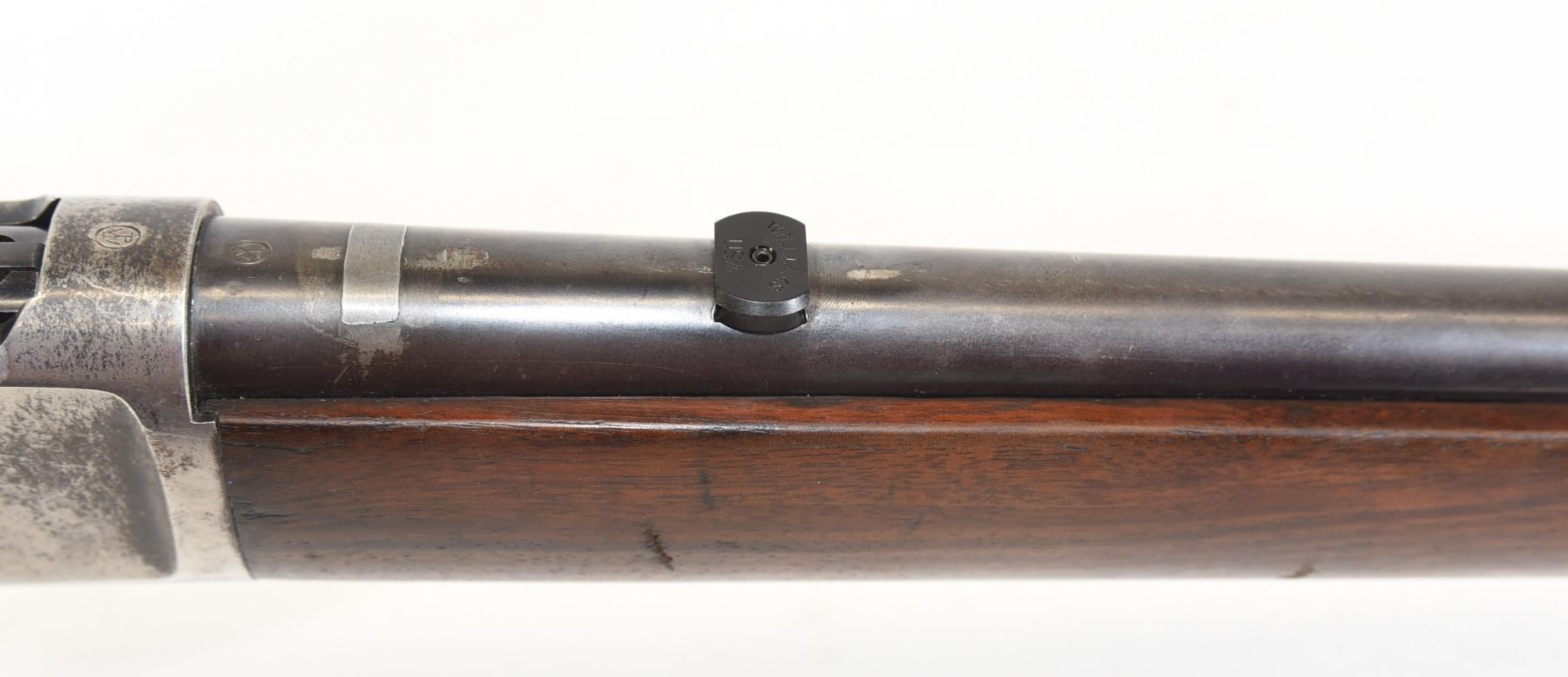Non-restricted, 25-20WCF, lever action, 19.5" barrel, SN 659006. Wood stock has many dents and scratches, but no cracks or chips and is in good condition considering age. Bluing is going grey and has many scratches. Bore is excellent. Rifle is missing the rear sight and the flip-up sight.