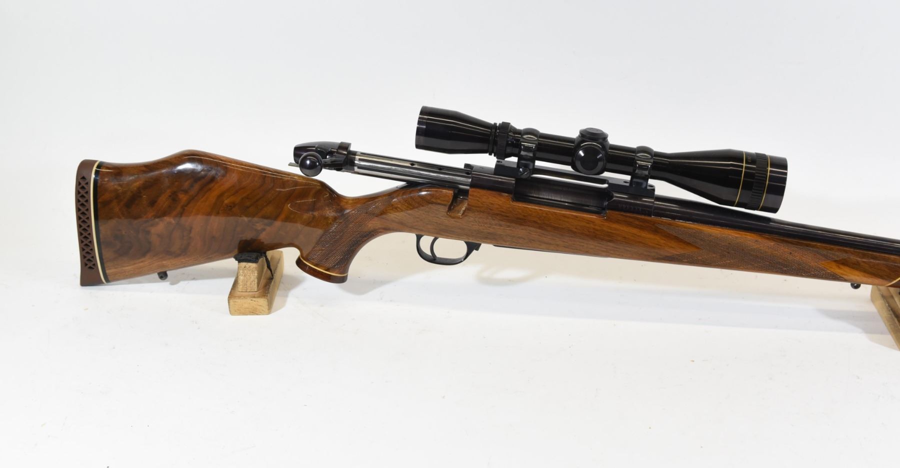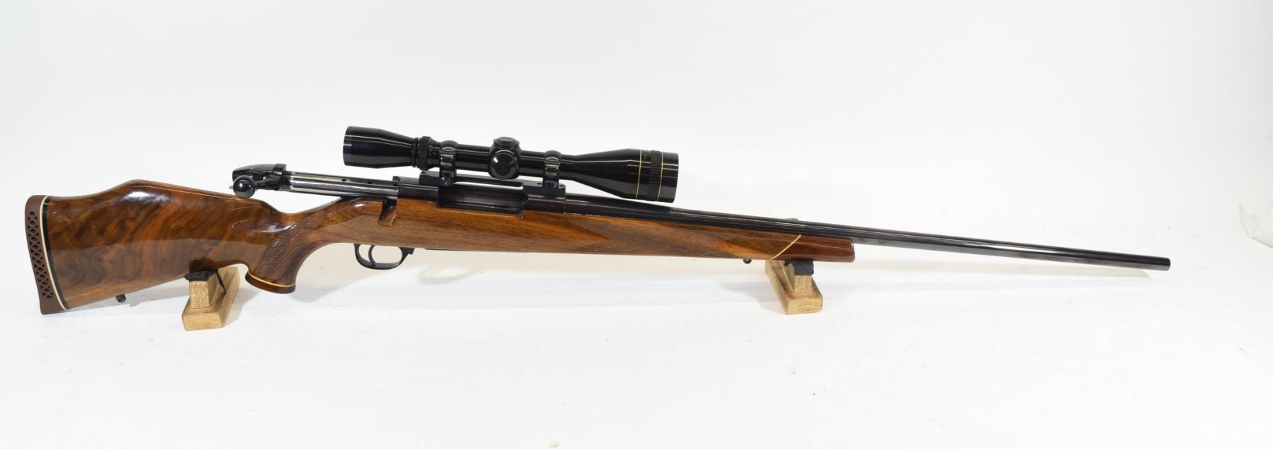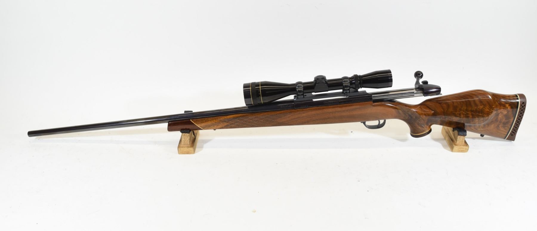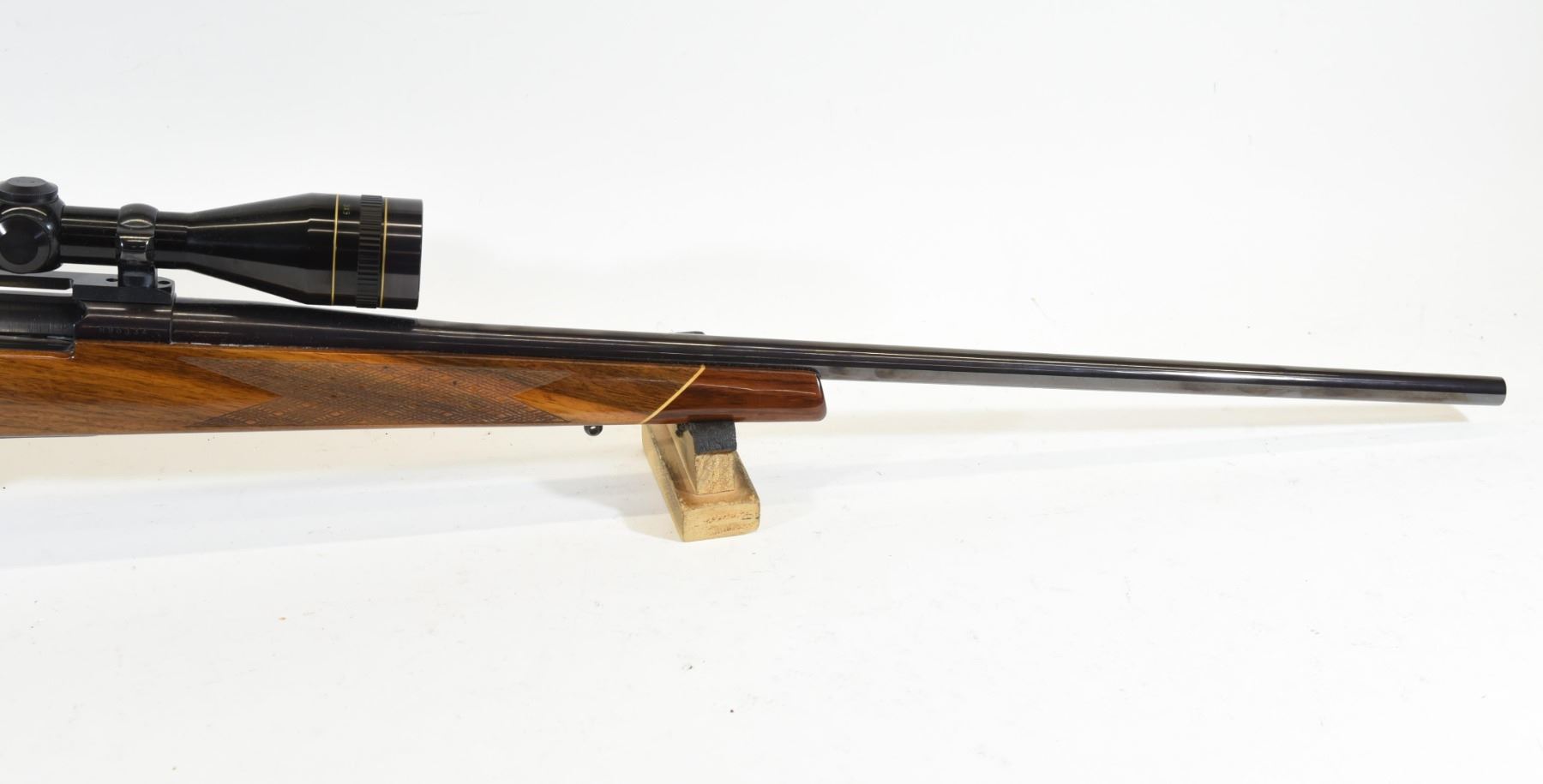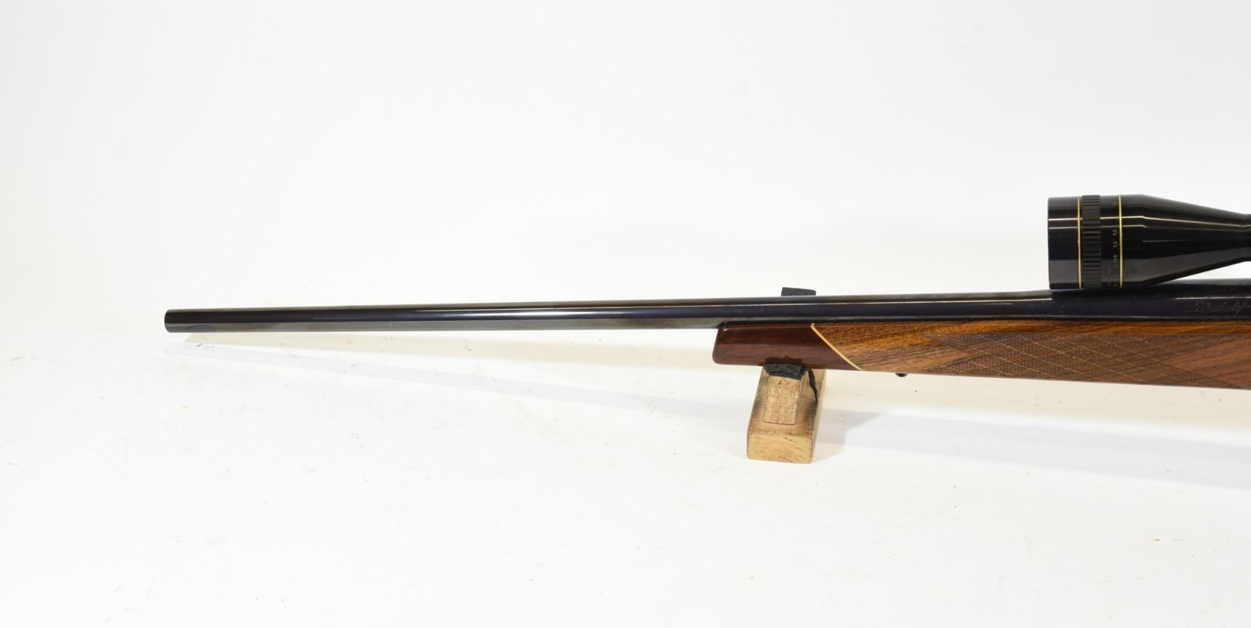 Non-restricted, 300Wby Mag, bolt action, SN H95334. Wood stock has one mark on top of the cheek pad, but is excellent otherwise. Bluing is excellent. Bore is lightly pitted near the muzzle, but good otherwise. Rifle has a Leupold 3x9 scope mounted.
