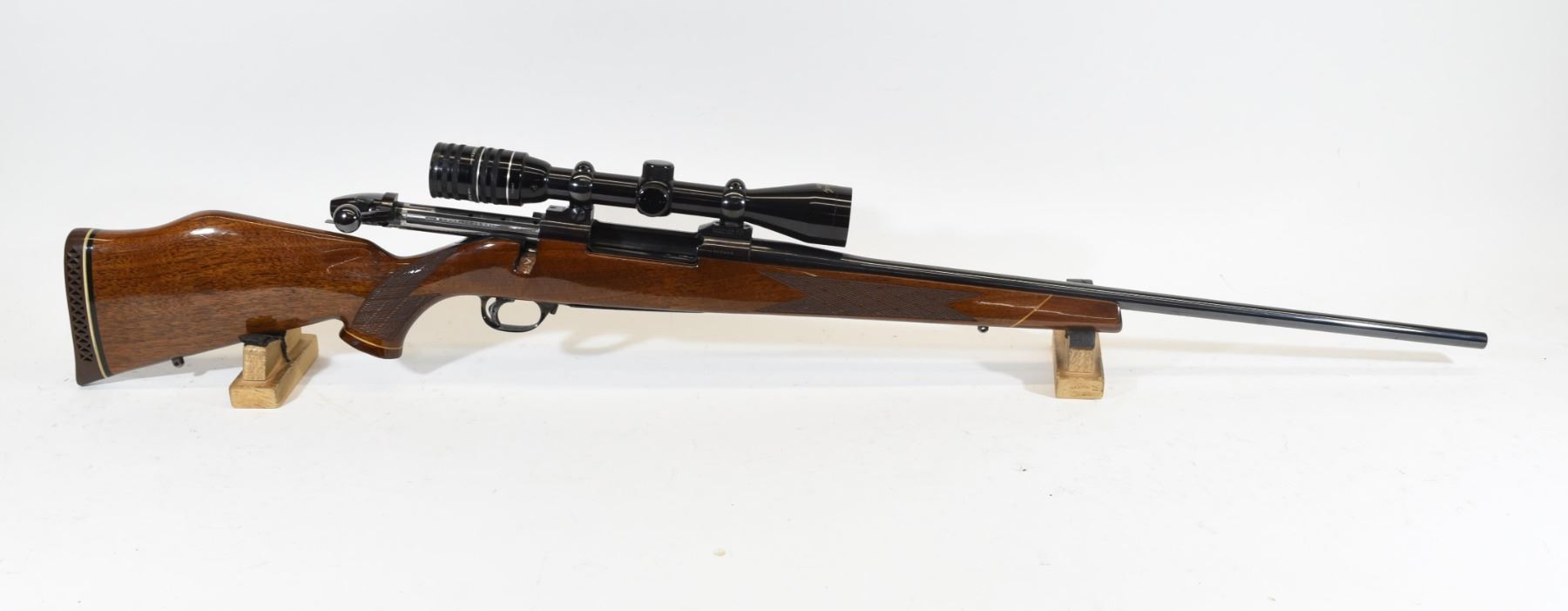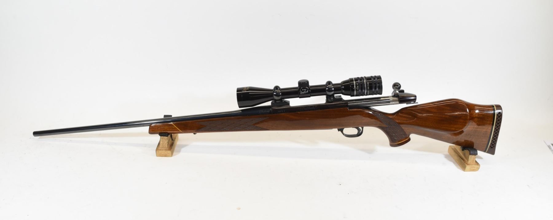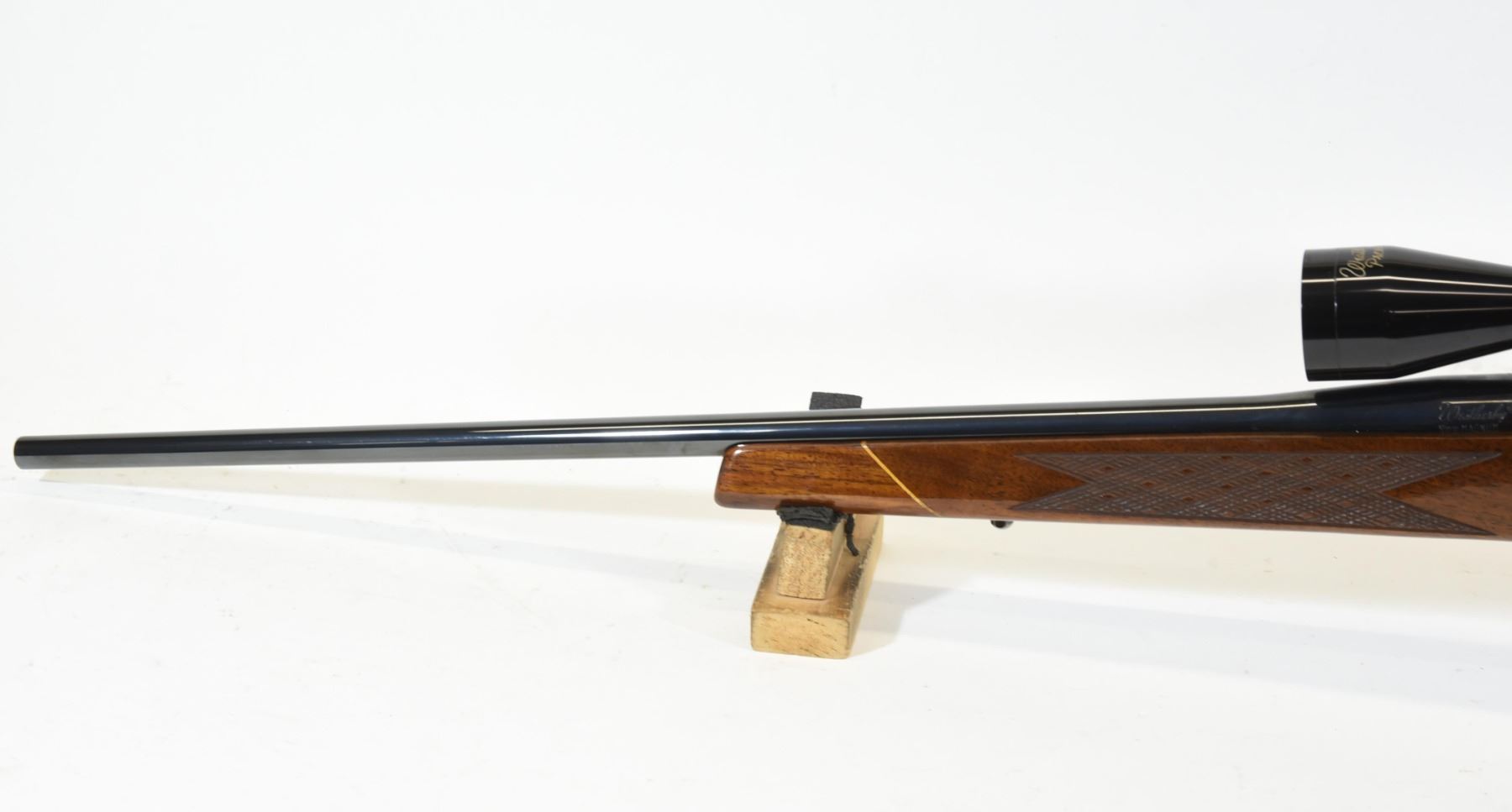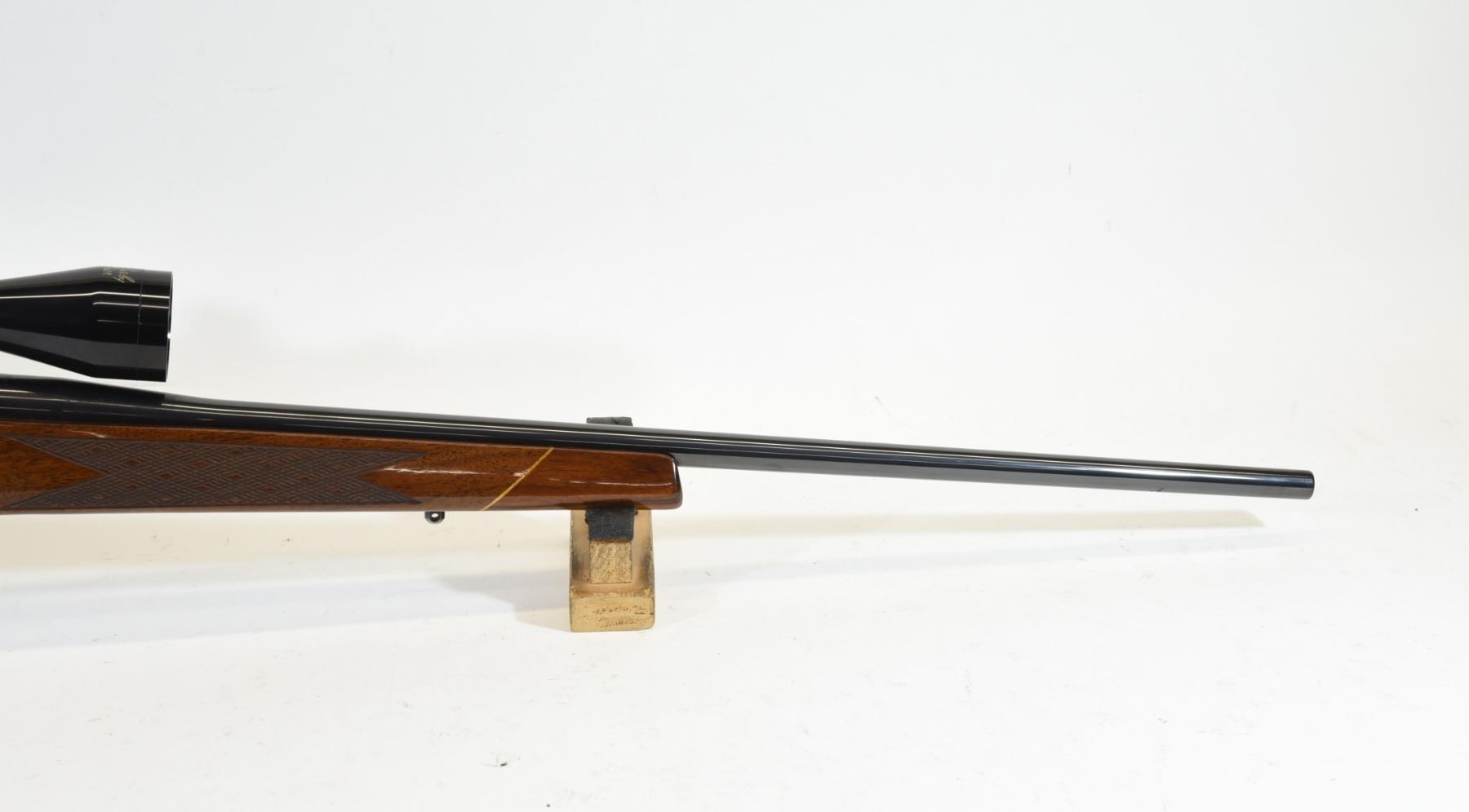 Non-restricted, 7mmWby Mag, bolt action, SN H89827. Wood stock has a few small marks, but is in very good condition overall. Bluing is good. Bore is excellent. Rifle has a Weatherby Premier 3-9x40 scope mounted.