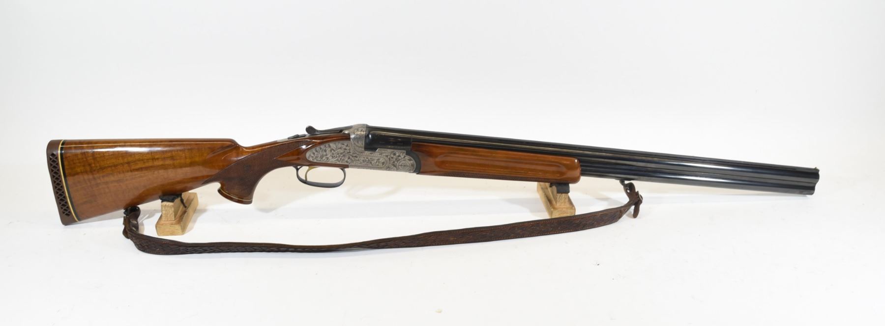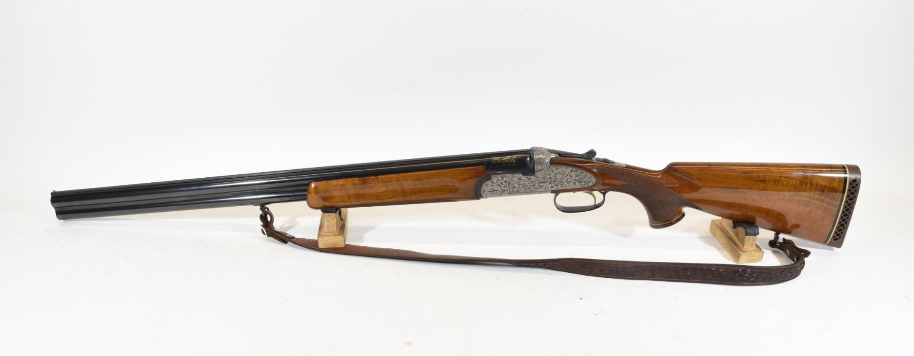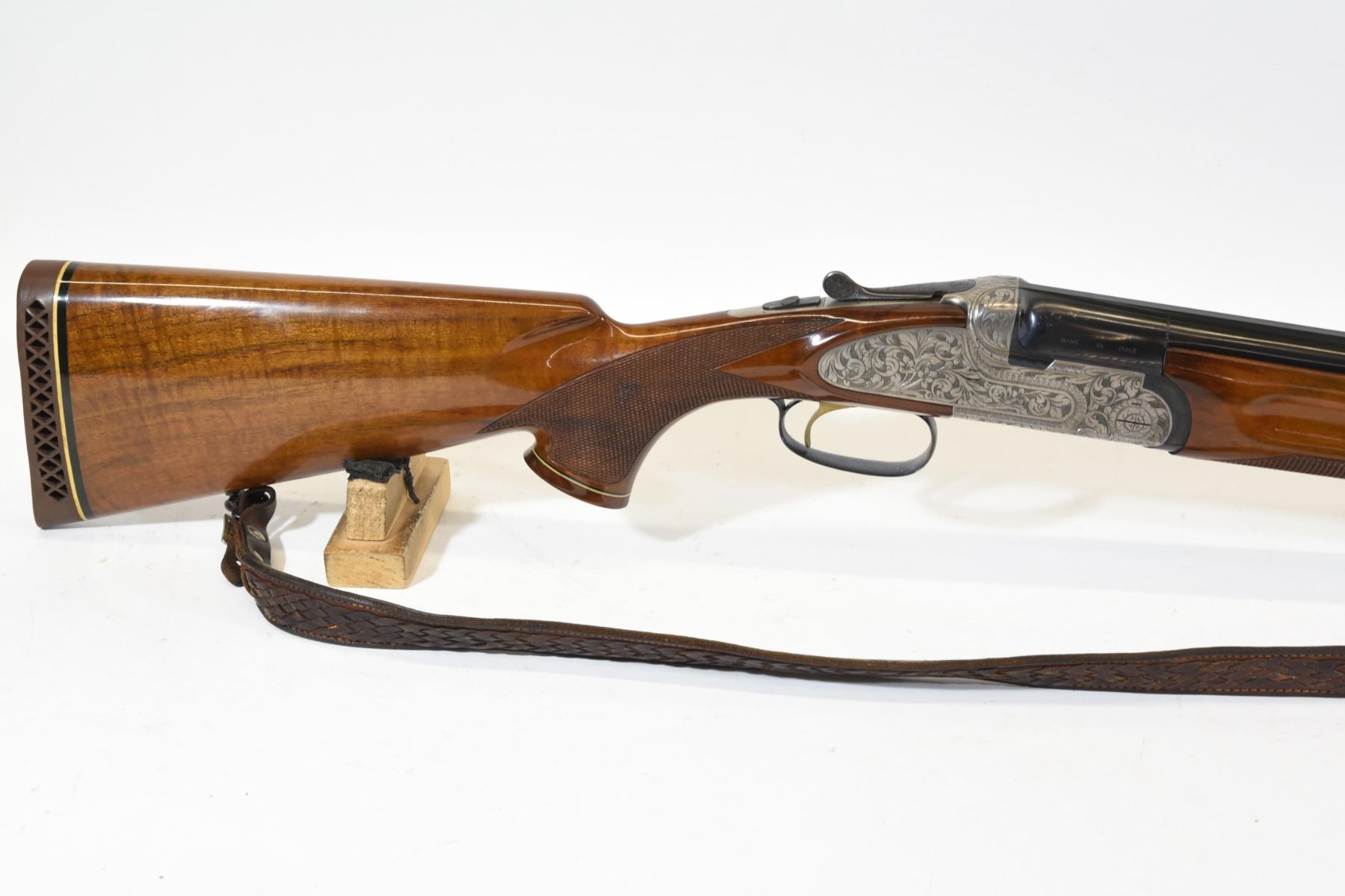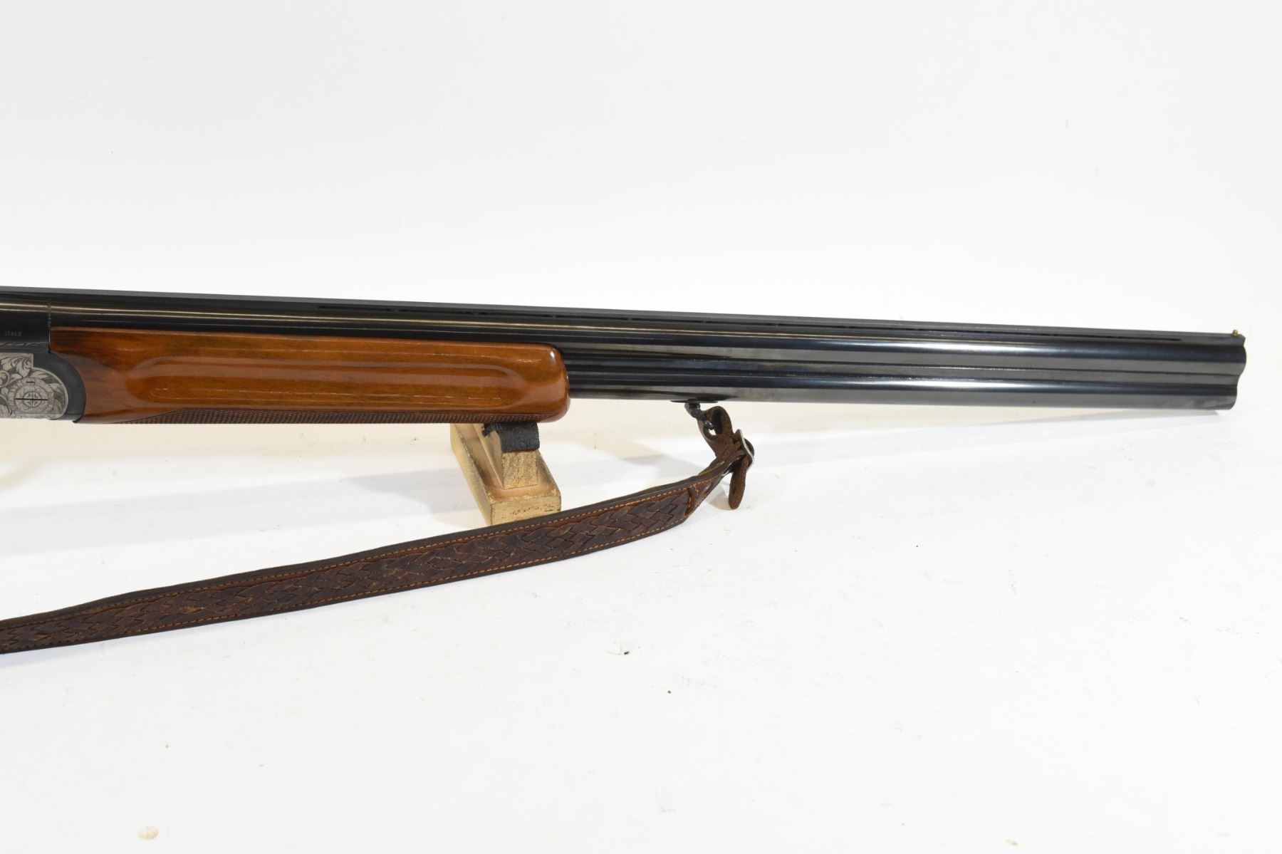 Non-restricted, 12ga 2 3/4", over/under, SN R02940. Wood stock has a few small marks around the swivel, but is in very good condition otherwise. Bluing has a few small marks, but is good overall. Bores are both excellent. Gun has a leather shoulder sling.