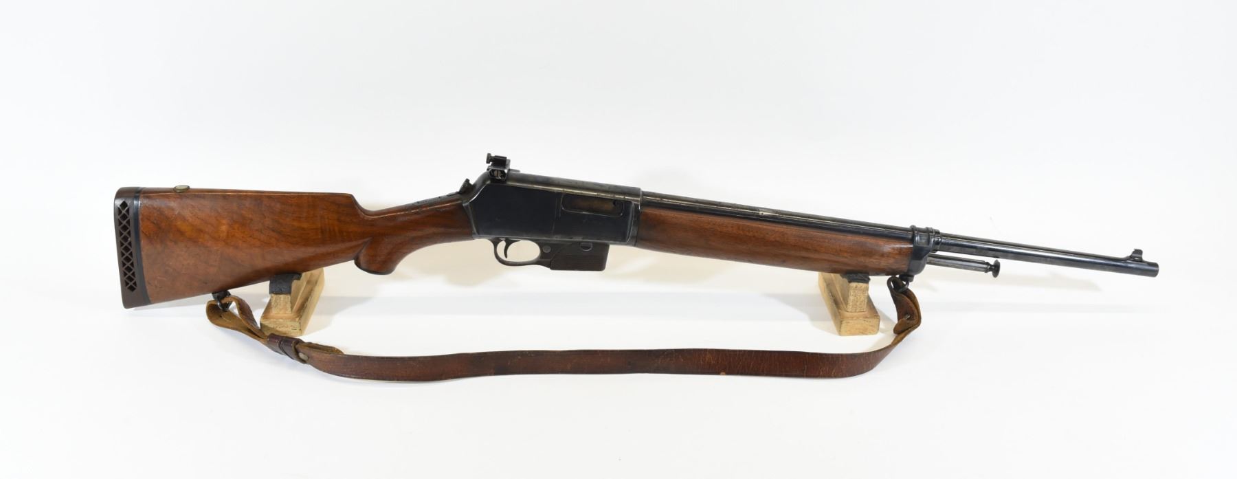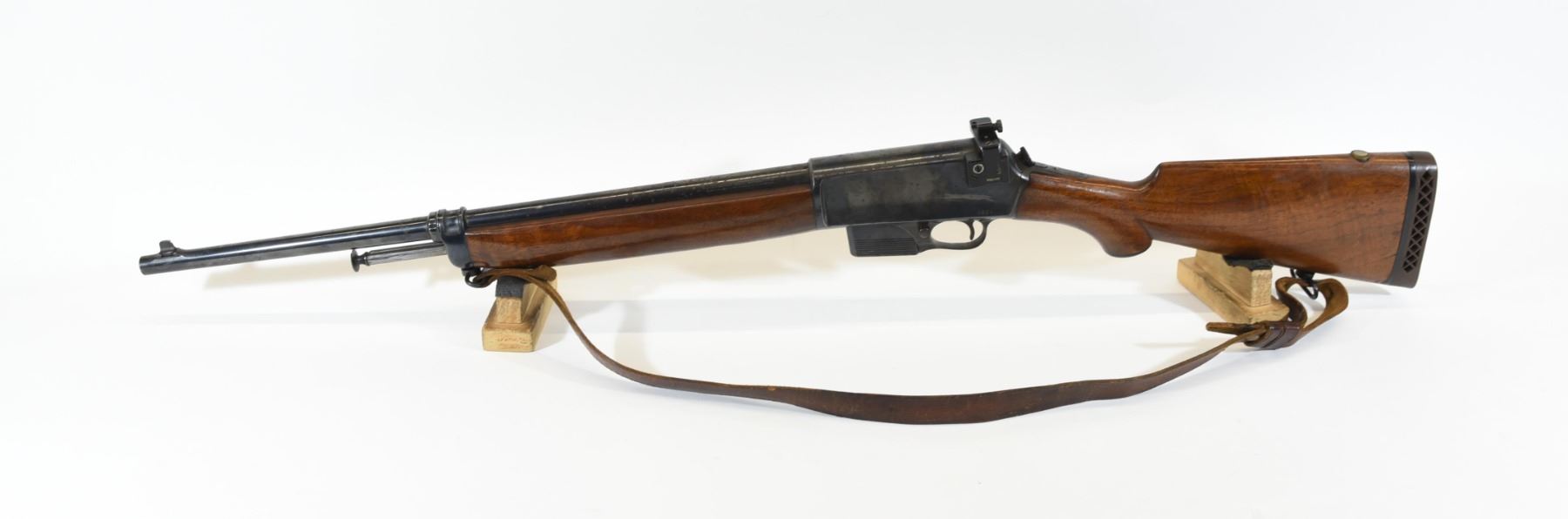 Non-restricted,semi auto, .351 caliber, 20" barrel, SN 4364. Wood has a couple of dents in the forestock and some light scratches in both stocks. Bluing has some rust spots and fading on the receiver. Bore is very good. Has a sling and Williams peep sight.
