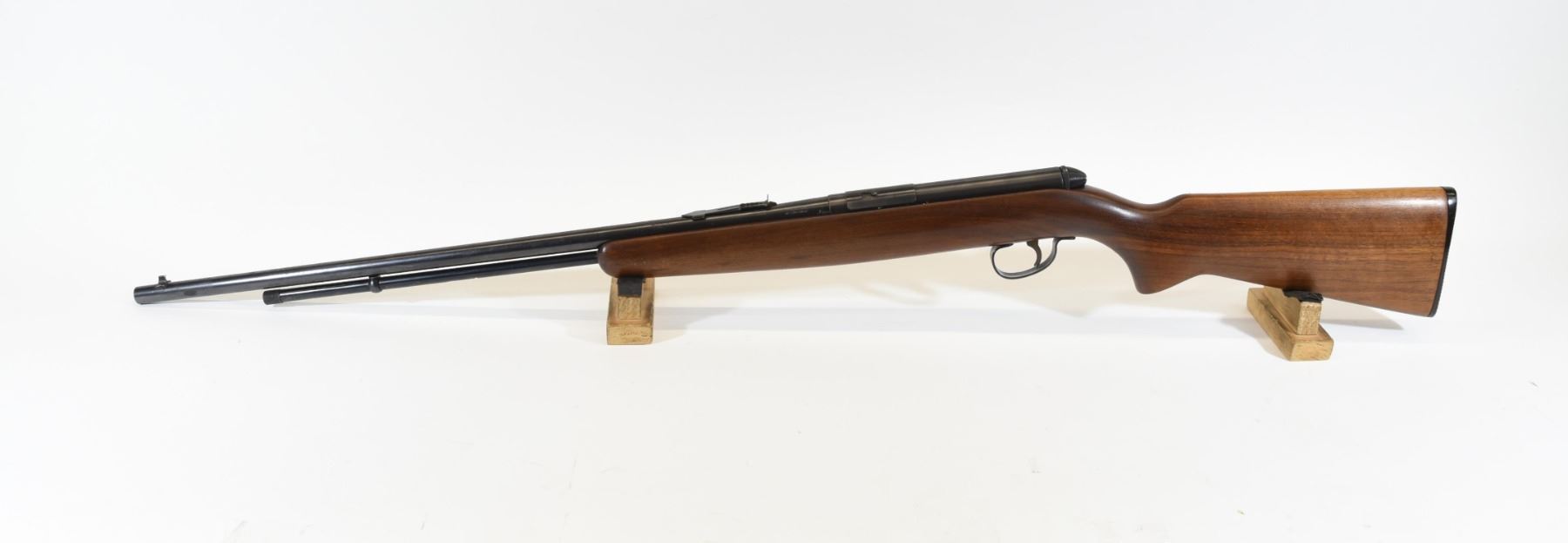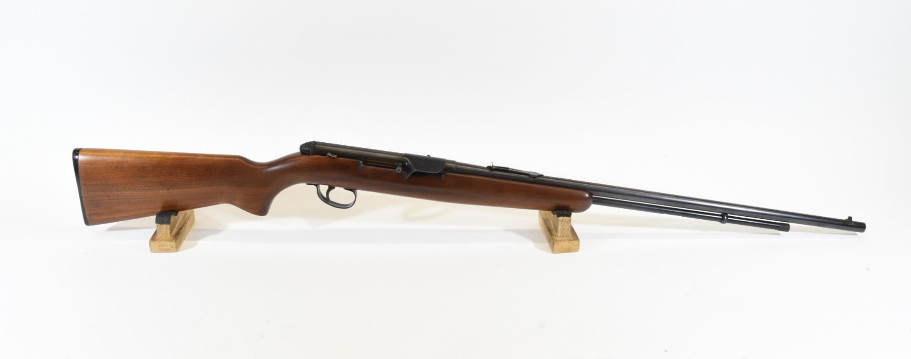 Non-restricted, 22cal, Semi Auto Tube Feed, SN none. Wood stock is very good, bluing is dark but pitted from rust. Bore is good.