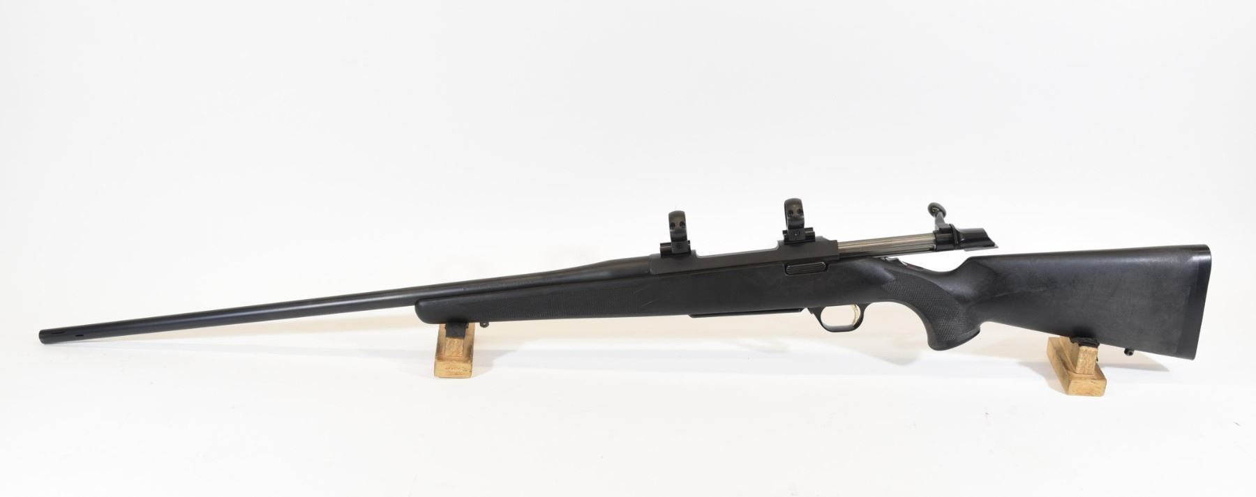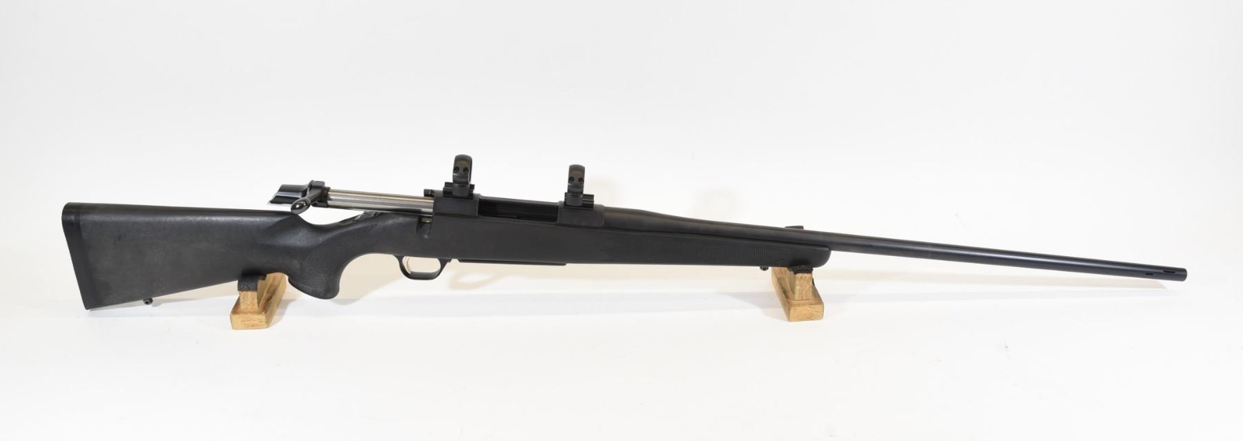 Non-restricted, 7mm Rem Mag, bolt action, 25.25" ported barrel, SN 74678PP7C7. Synthetic stock has many light scratches, but is in good condition overall.,Bluing is good but has three scratches on the left side of the barrel and action as well as two small speckles of rust on top of the barrel. Bore is excellent. Rifle has 1" rings mounted.