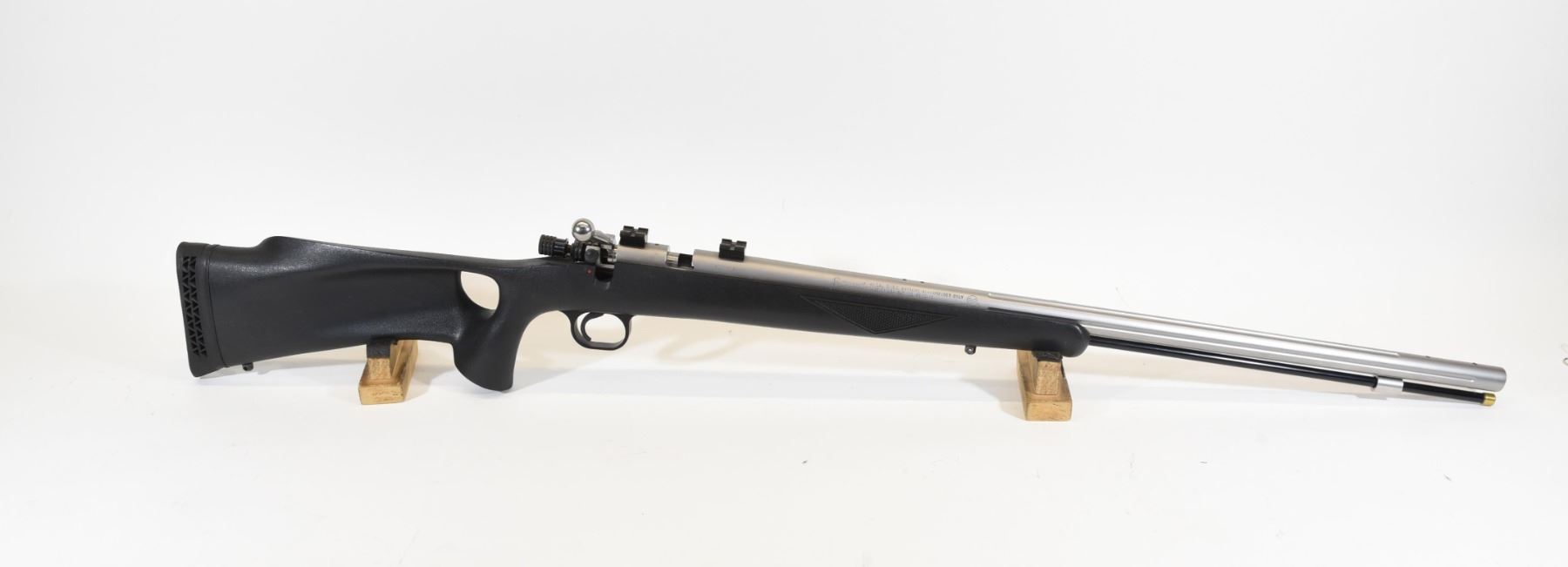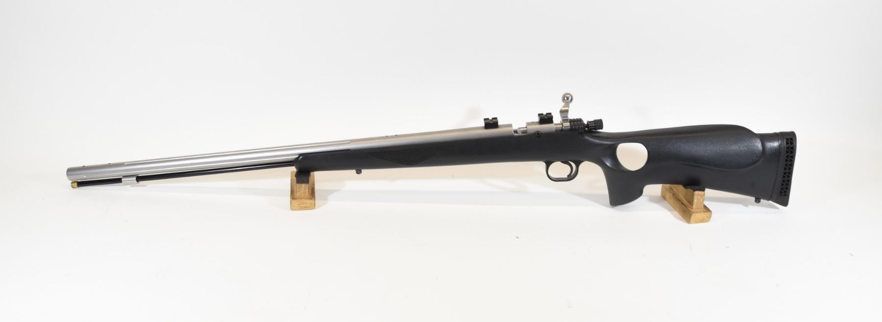 Non-restricted, 45cal Black Powder, muzzle loader, SN S001732. Synthetic stock has one mark on the left side near the trigger guard, but is in very good condition otherwise. Barrel finish has several scratches, but is good overall. Bore is good. Rifle comes with original accessories.