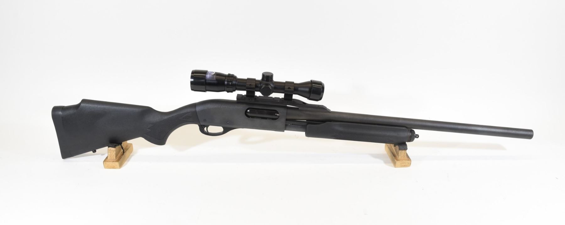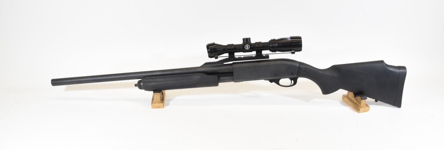 Non-restricted, 12ga 3", pump action, 22.5" rifled slug barrel, SN AB477165M. Synthetic stock has many light scratches, but is in good condition. Bluing is good aside from a few light scratches and a few light speckles of rust. Bore is good. Gun has a Bushnell Banner 2-4X scope mounted.