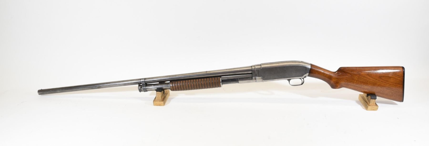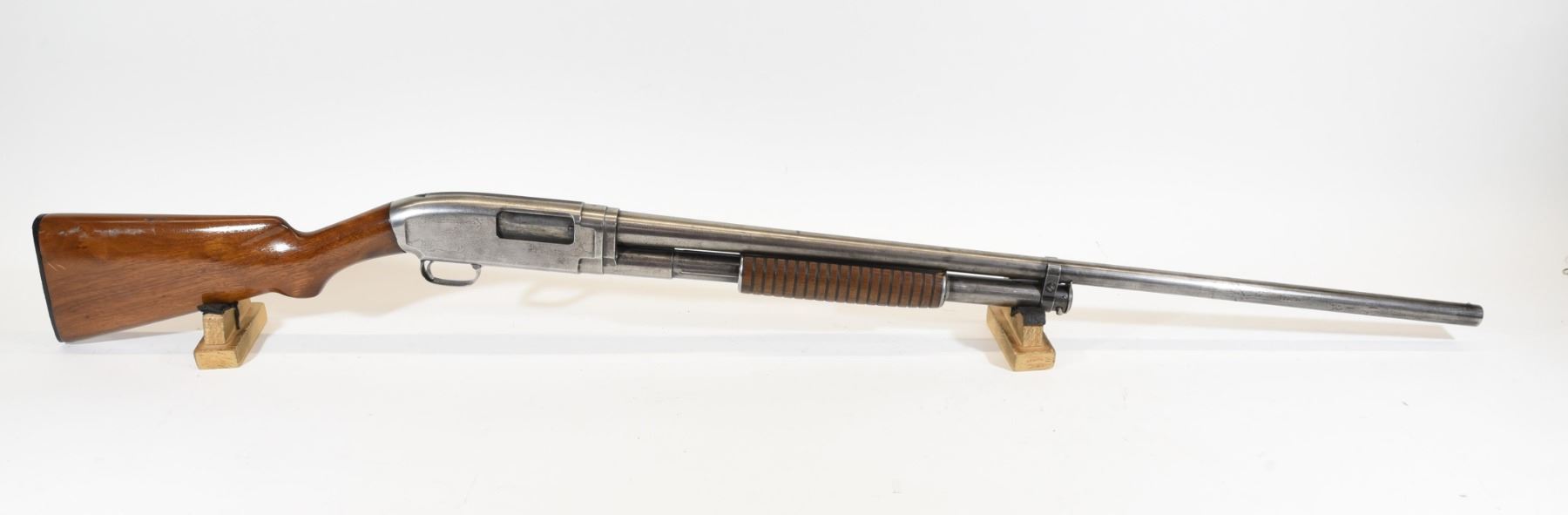Non-restricted, 12ga, 31" nickel steel fixed full choke barrel, SN 399250. Wood stock has several dents and scratches but is good overall. Bluing has gone grey with many scratches and is pitted throughout the last 1/3 of the barrel. Bore is lightly scratched throughout with some light pitting near the muzzle.