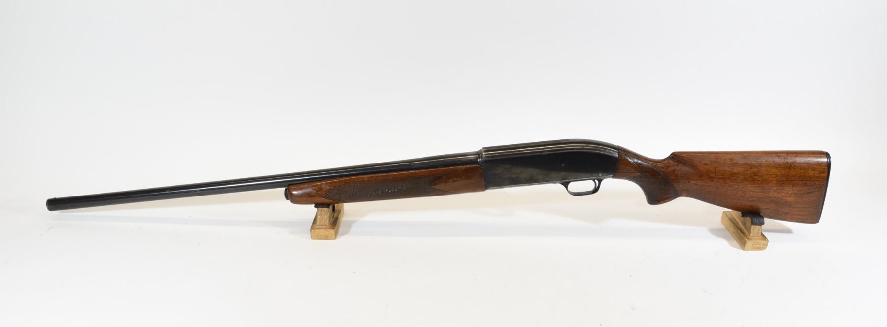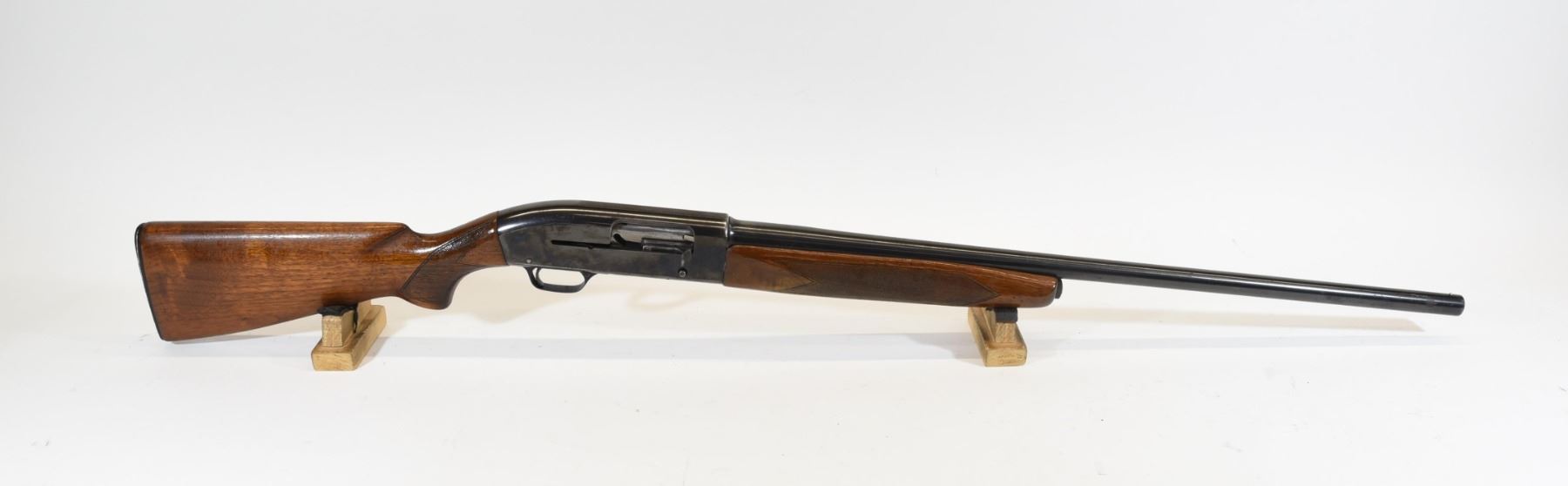 Non-restricted, 12g a 2 3/4", 27" fixed full choke barrel, SN 109575. Wood stock has several dents and scratches, but is good overall. Bluing has many scratches and bare patches as well as several spots of pitting. Bore is lightly scratched throughout, but good otherwise. Bolt does not lock open.