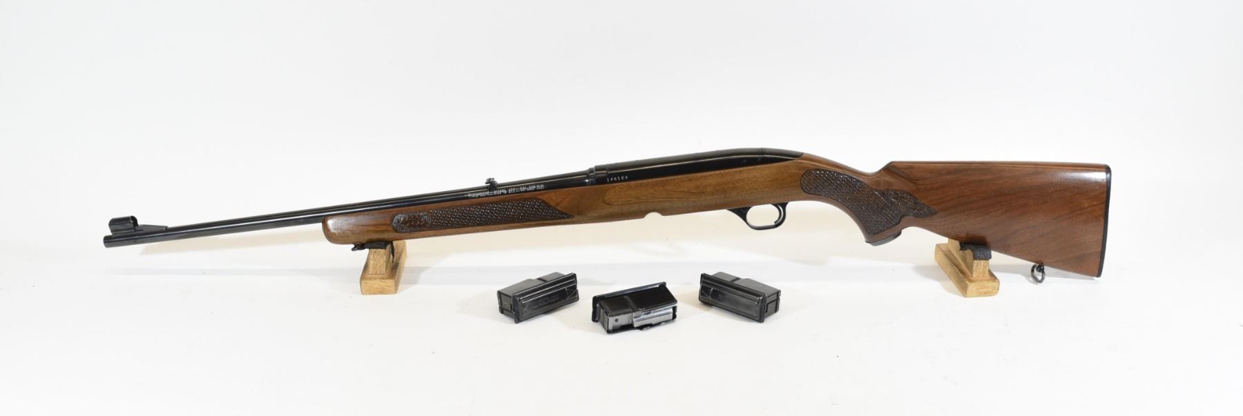 Non-restricted, 308Win, semi-auto, SN 146104. Wood stock has a few small and light scratches, but is in very good condition otherwise. Bluing has several small scratches, but is good overall. Bore is excellent. Rifle comes with three magazines.