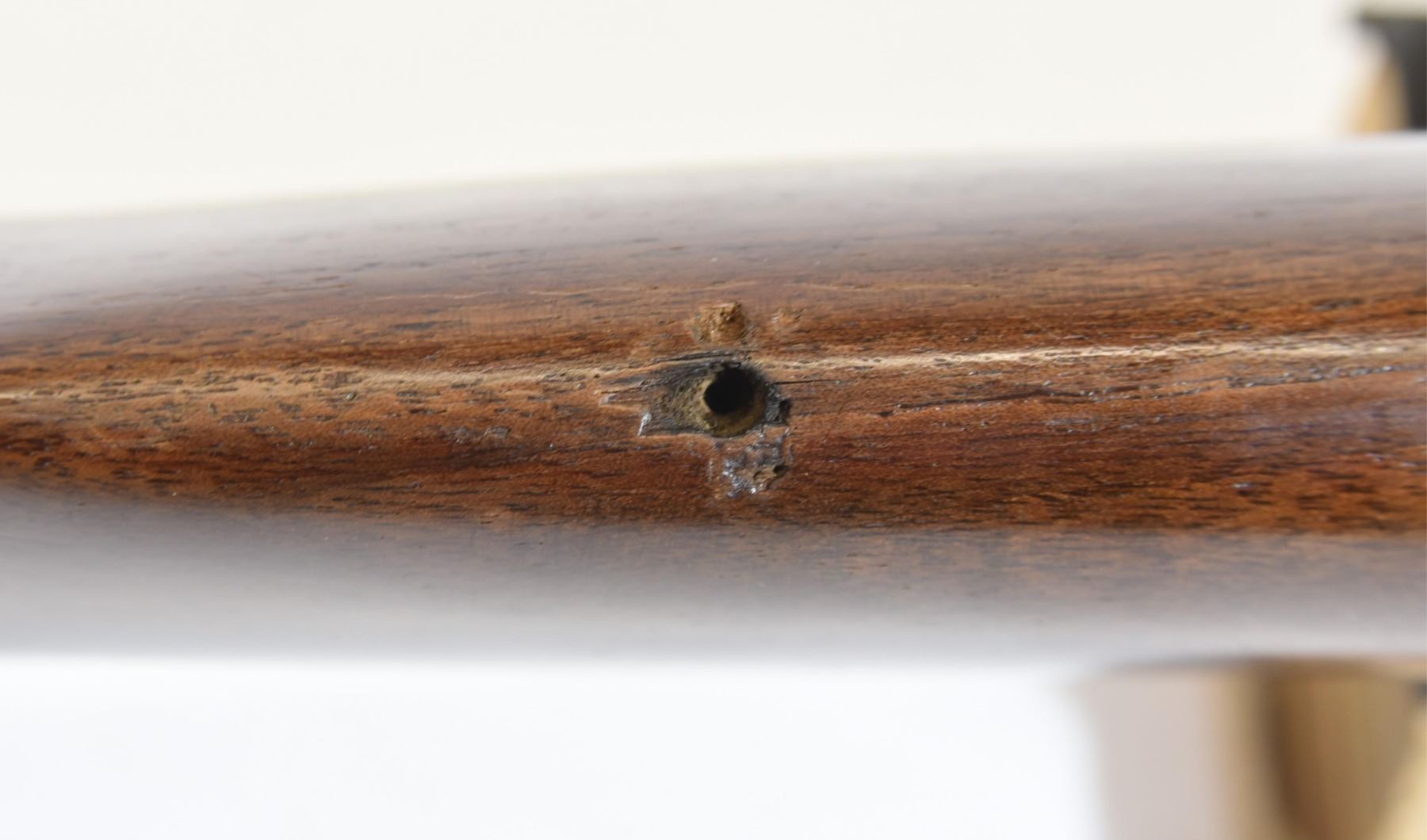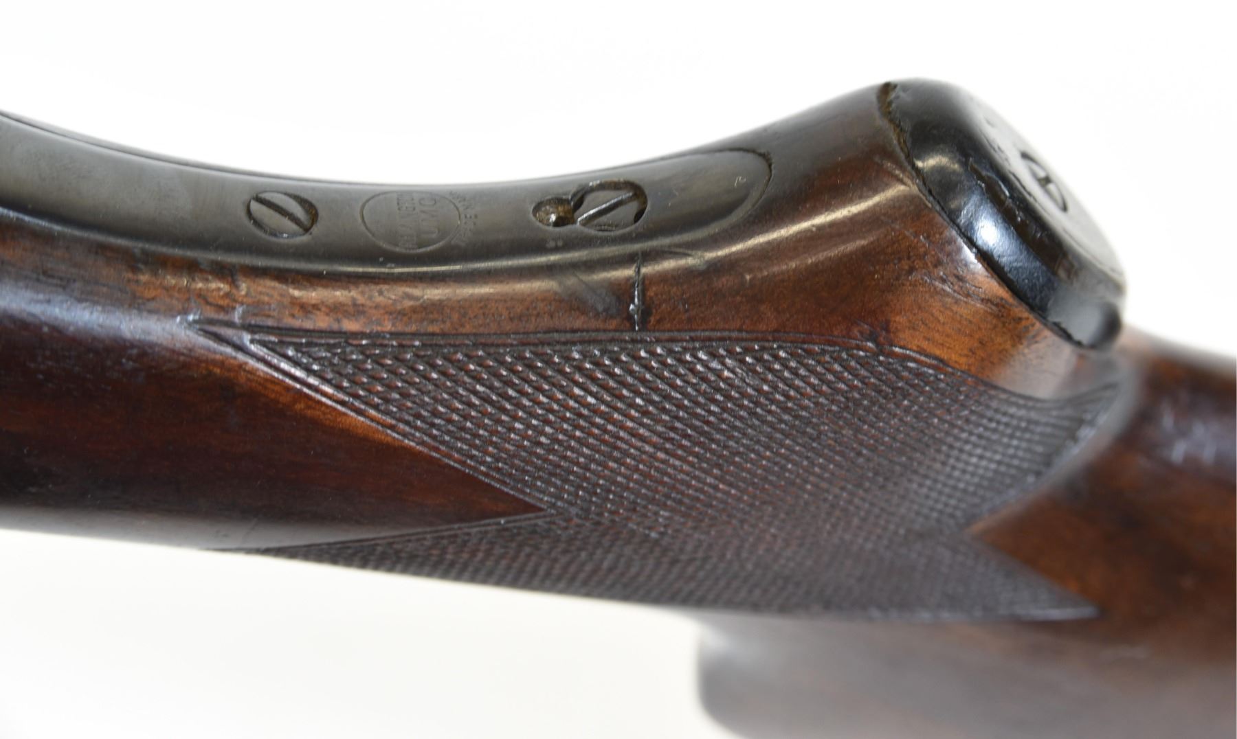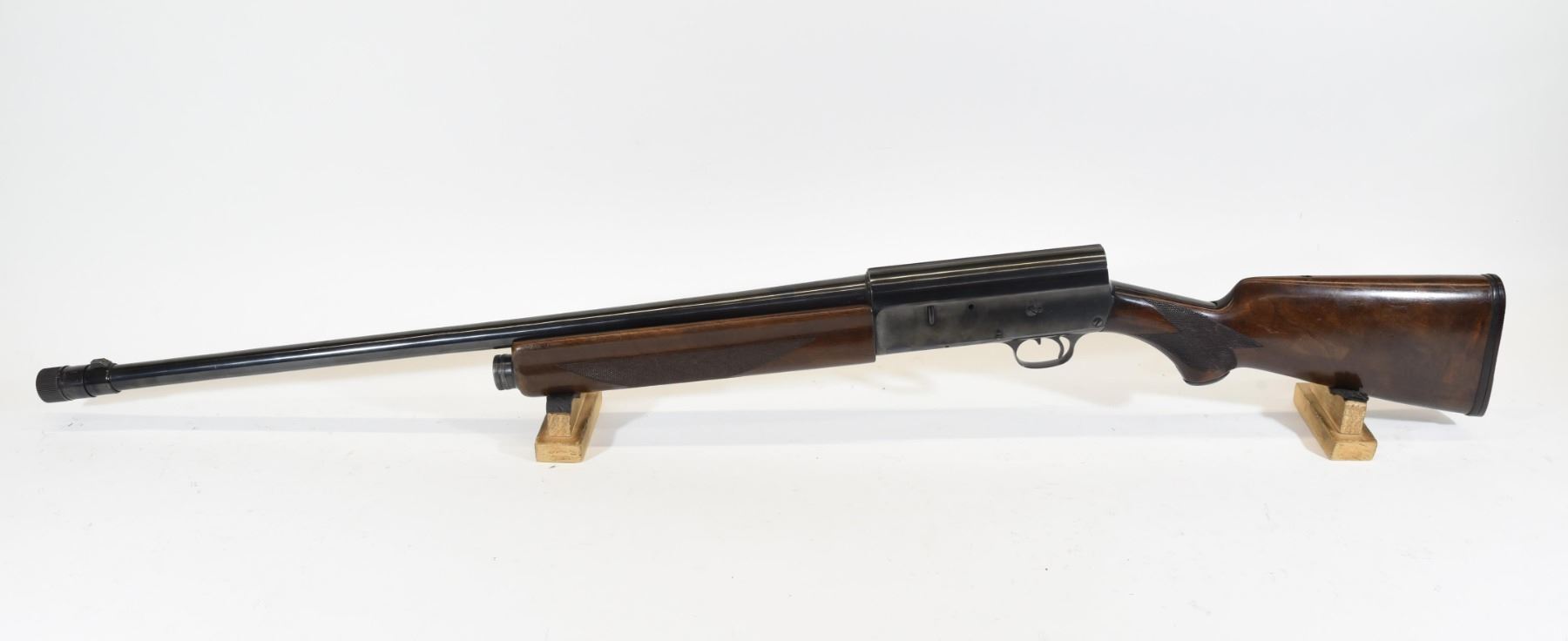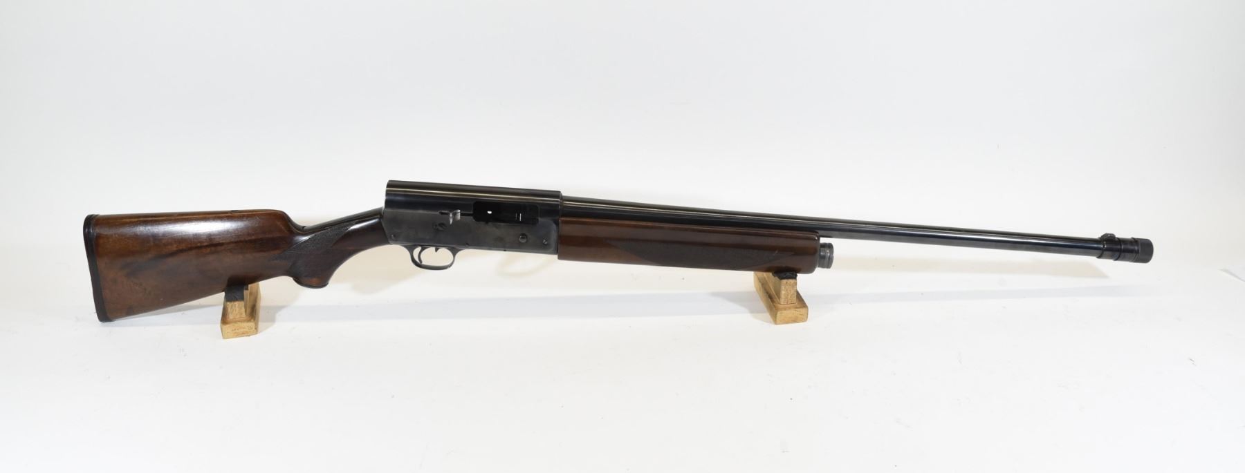 Non-restricted, 12ga, semi-auto shotgun, SN 192191. Wood stock has many dents and scratches with a drill hole in the top of the butt stock and one small crack near the lower tang. Bluing has several scratches, but is good otherwise. Bore has two patches of pitting. Gun has a polychoke.