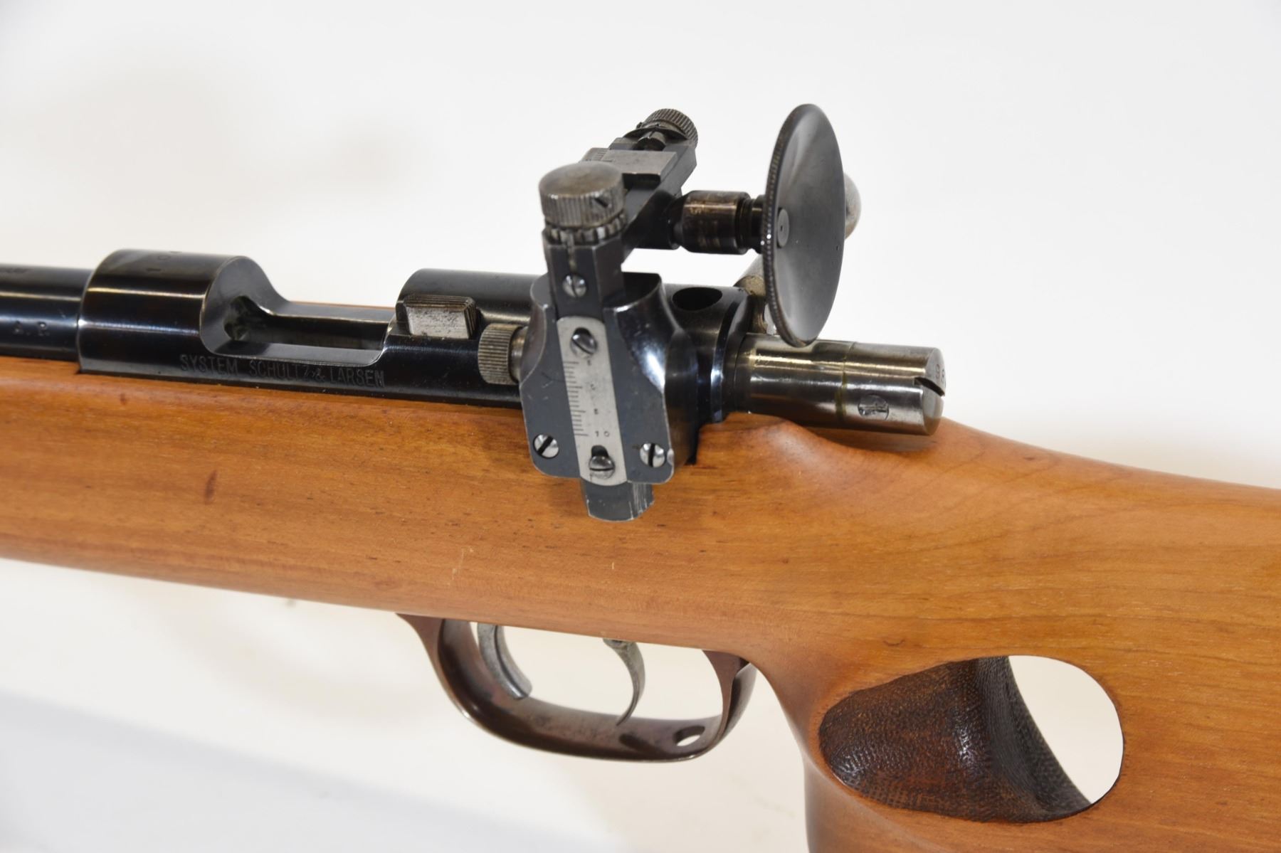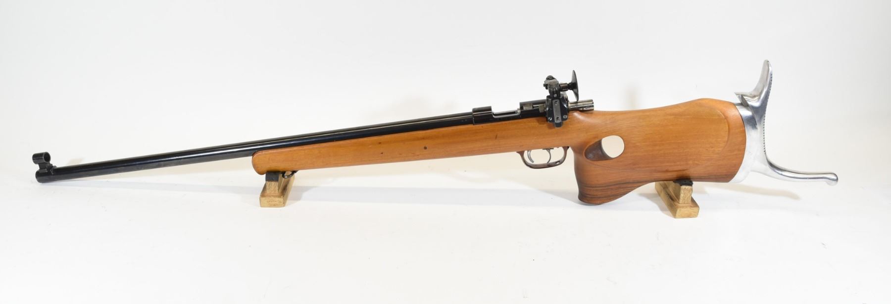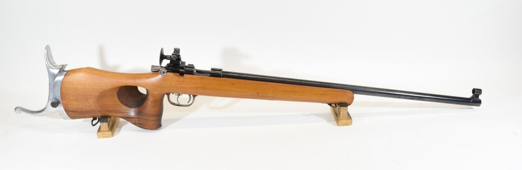 Non-restricted, 22cal, bolt action single shot, 27.5" heavy target barrel, SN 1041. Wood stock has several scratches and dents, but is in good condition otherwise. Bluing has many light scratches. Bore is good. Rifle has an aperture target sight system.