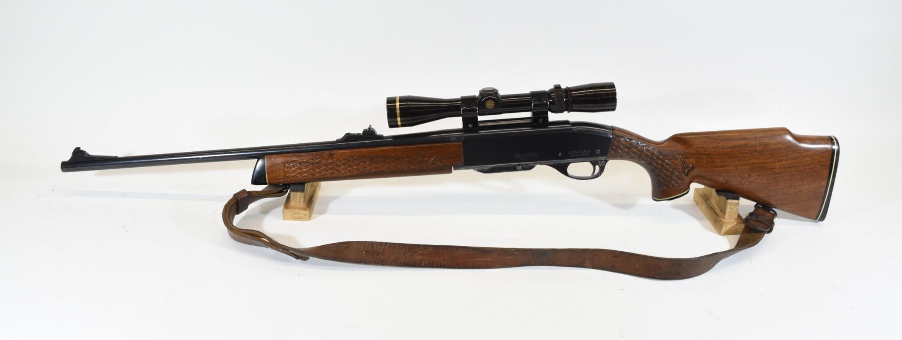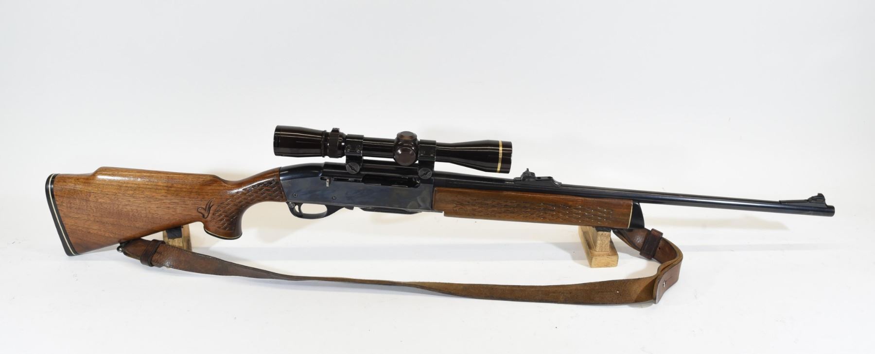 Non-restricted, 30-06SPRG, semi-auto, SN 6938112. Wood stock has many light scratches and dents, but is in good condition overall with weaved checkering. Bluing has many scratches. Bore is good. Rifle has a Leupold Vari-X-III 2.5x8 scope mounted and a leather shoulder sling.