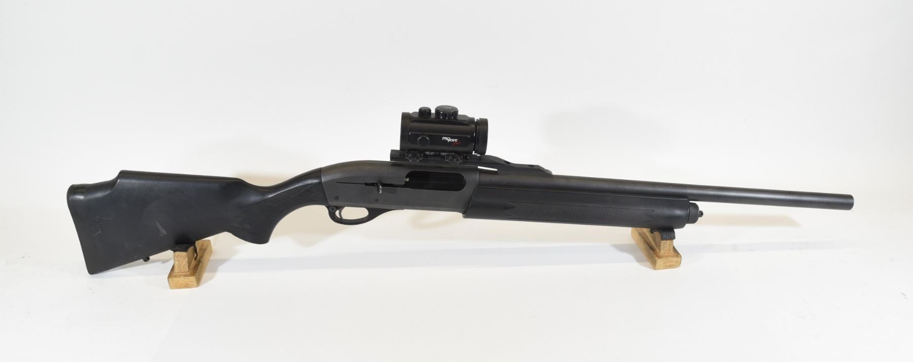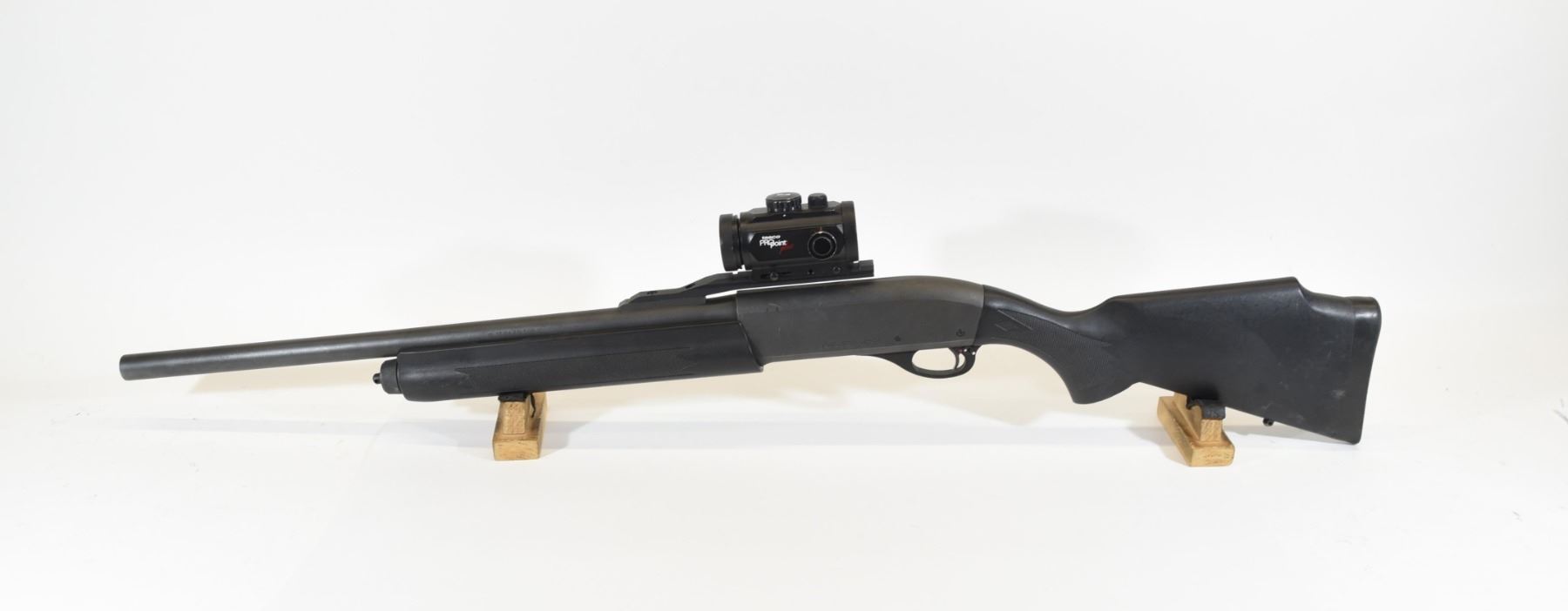 Non-restricted, 12ga 3", semi-auto, 20.5" rifled barrel, SN P0720769. Synthetic stock has many light scratches, but is good overall. Bluing has many scratches and one patch of rust on top of the action. Bore is good. Has original Remington J key. Gun has a Tasco Pro Point Plus sight mounted.
