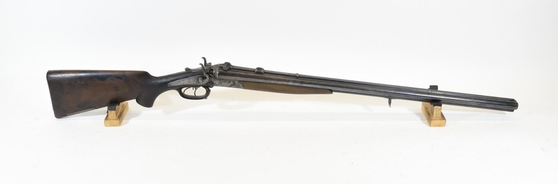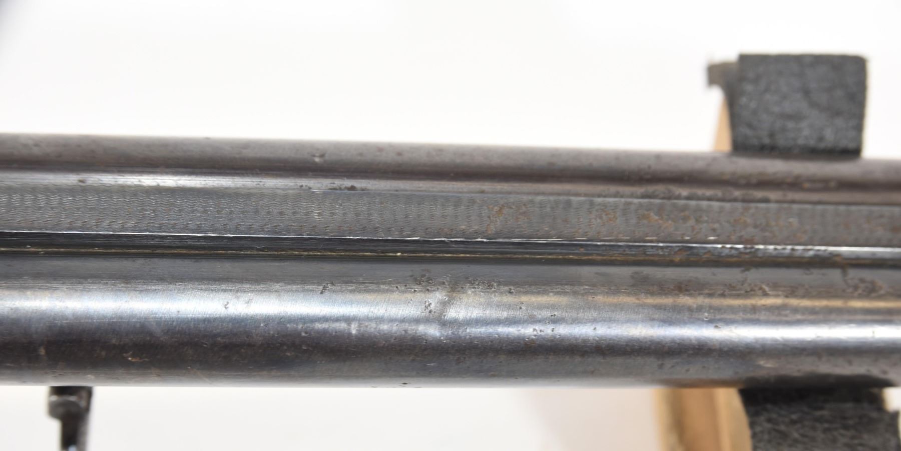 Non-restricted, 16ga side x side over unknown obsolete German rifle caliber, SN 2013. Wood stock has many dents and scratches with one crack through the rear grip. Bluing is going grey with light pitting throughout. Bores are lightly pitted in places and the right 16ga barrel has a dent. Rifle barrel measures 8.8mm dia. but true caliber is unknown. Hinge action has intricate engravings of Elk, Partridge, Rabbit, and White-tail. Underside of butt stock has compartment for 4 extra rounds of rifle ammo.