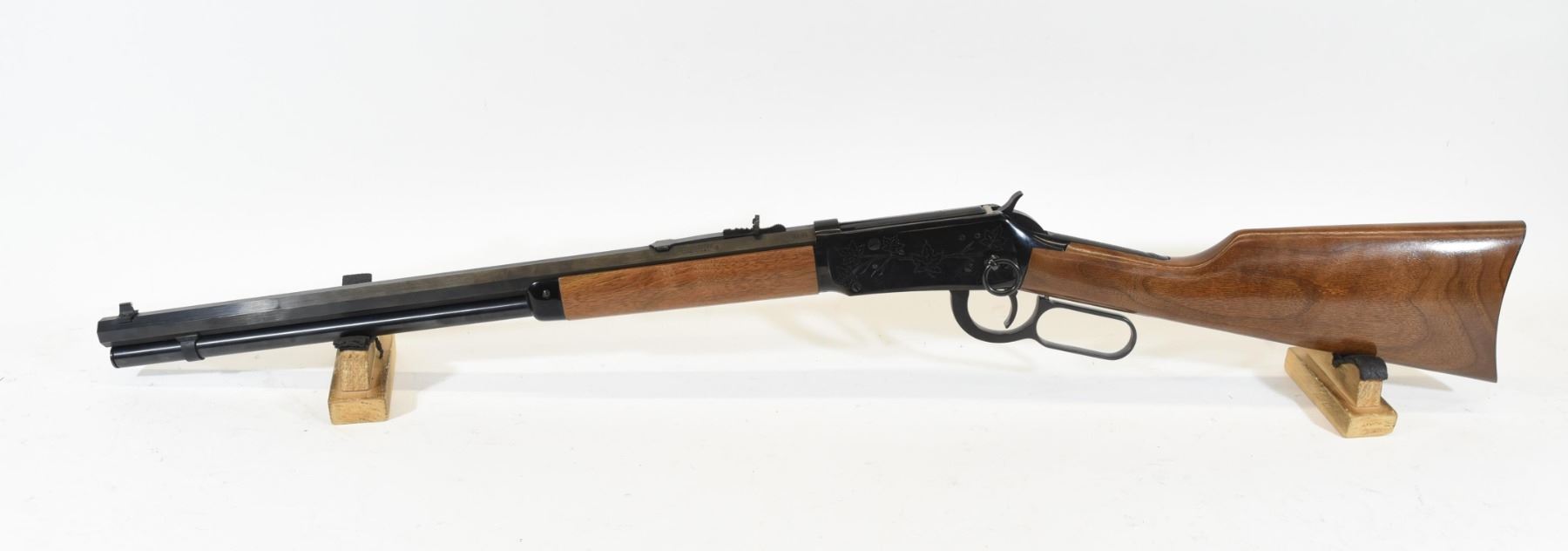 Non-restricted, 30-30Win, lever action, 19.5" octagonal barrel, SN 41335. Wood stock has a few very small marks, but is in good condition. Bluing is good. Bore is good. Rifle has "Canadian Centennial '67" on the upper tang, maple leaf engravings on the sides of the action, and "Canadian Centennial 1867-1967" on the top right of the barrel.