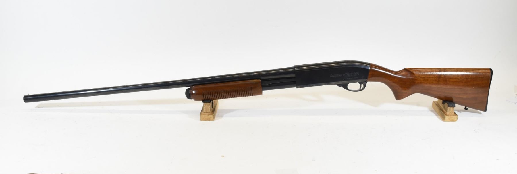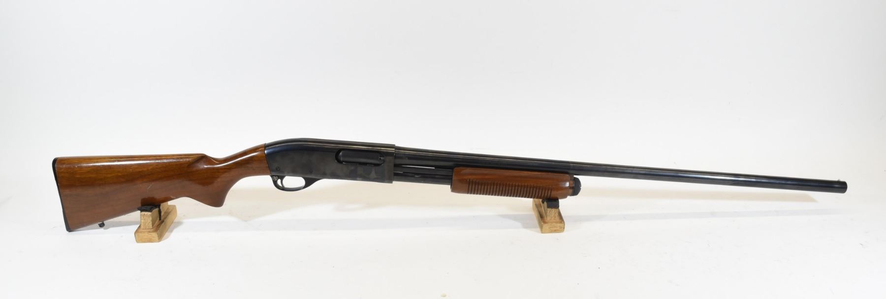 Non-restricted, 12ga 2 3/4", pump action, 29.5" fixed full choke barrel, SN T293357V. Wood stock has several dents and scratches, but no cracks. Bluing has a few small marks, but is good overall. Bore is good. Bolt has been swapped with an 870 Express bolt.