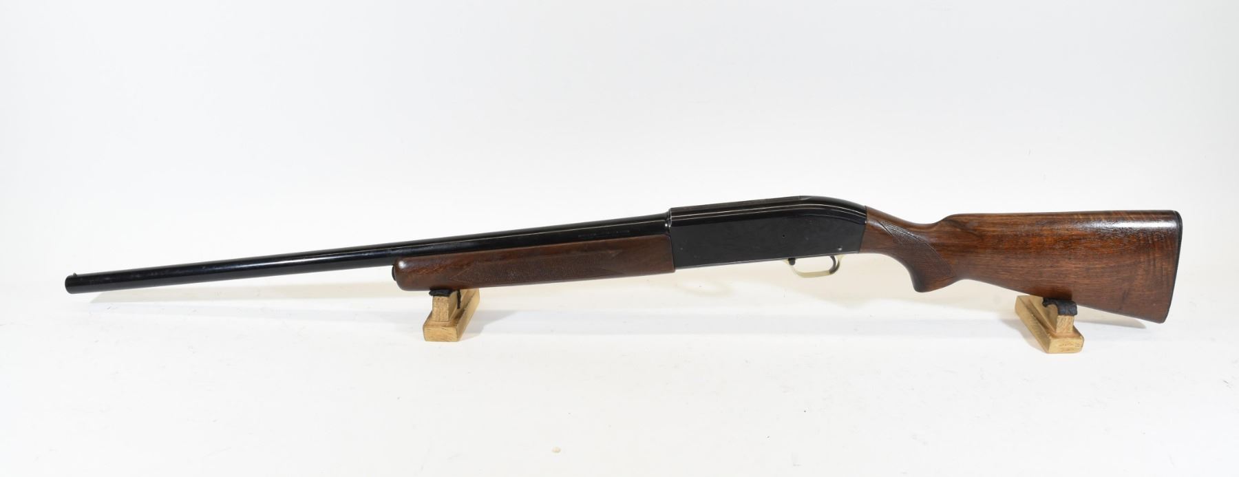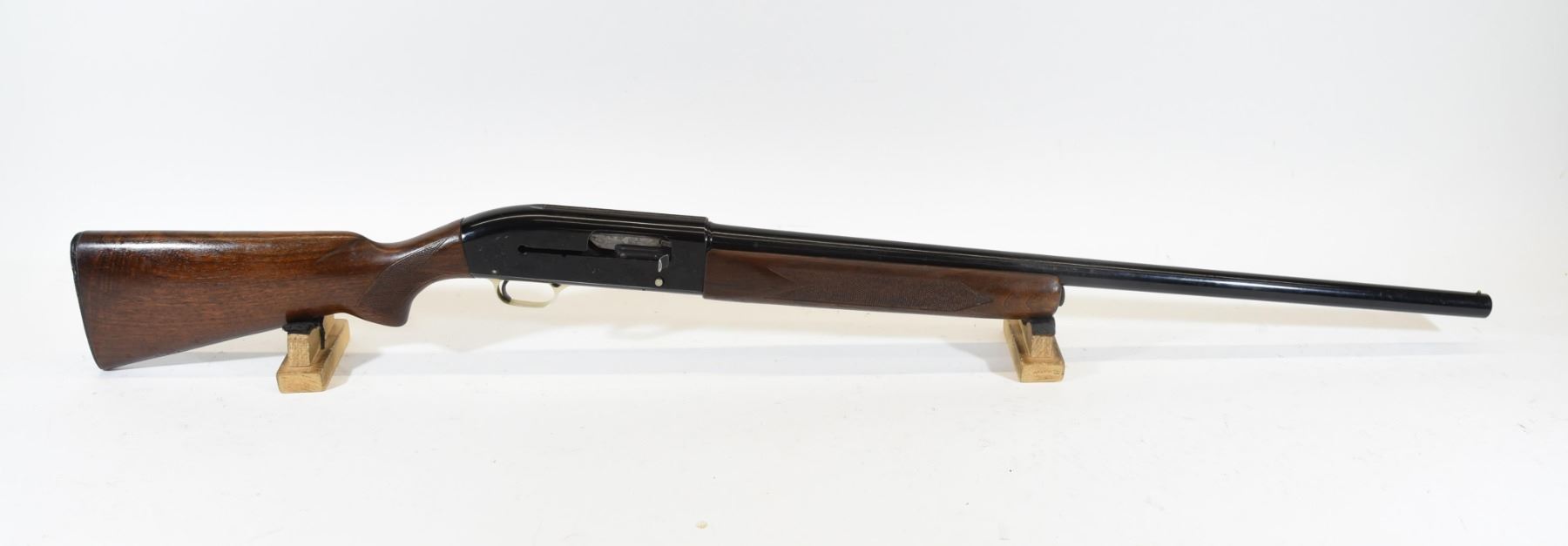 Non-restricted, 12ga 2 3/4", semi-auto, 27" fixed full choke barrel, SN 40977. Wood stock has a few minor marks. Bluing has many scratches. Bore is good.