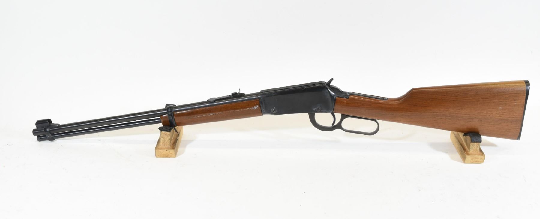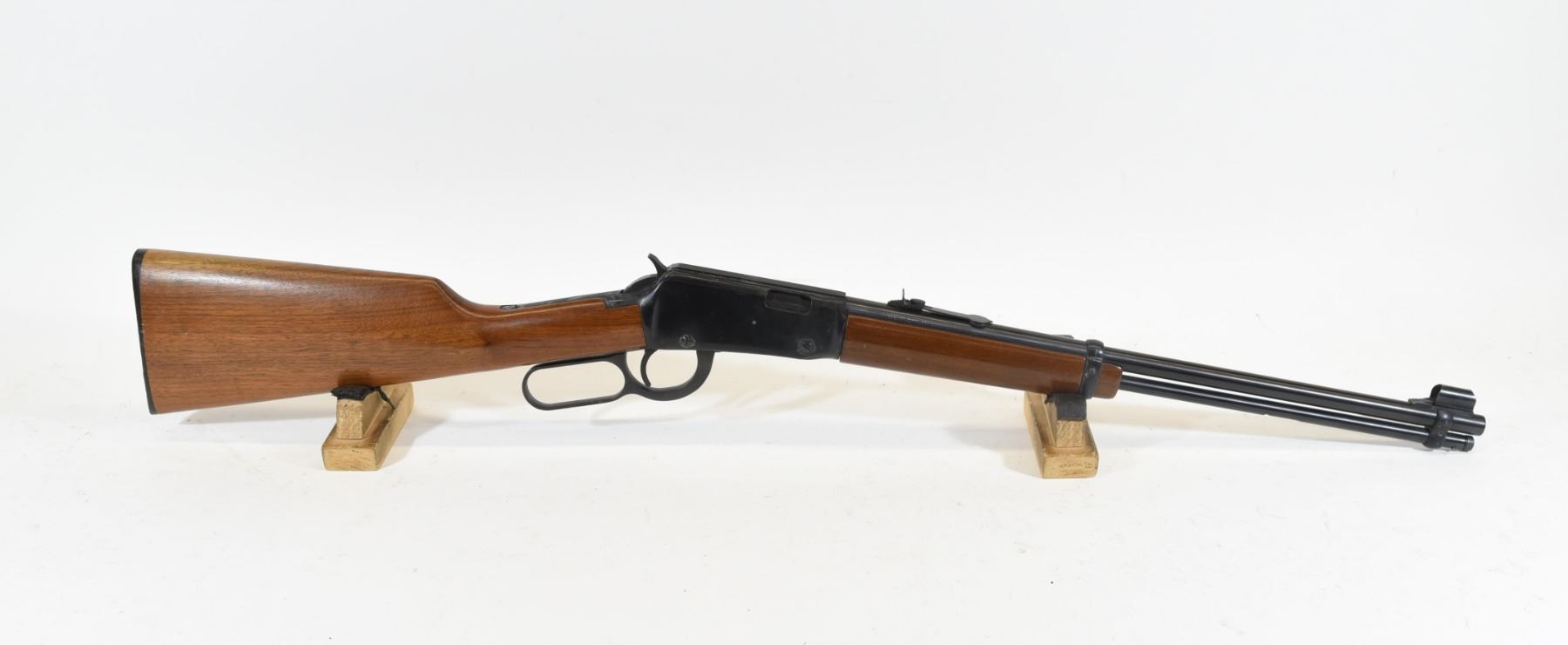Non-restricted, 22LR, lever action, SN 72028143. Wood stock has several scratches and dents as well as a white mark on the left side of the foregrip, but is good overall. Bluing is going grey under the action and has a few scratches throughout as well as odd discolouration around the action. Bore is good.