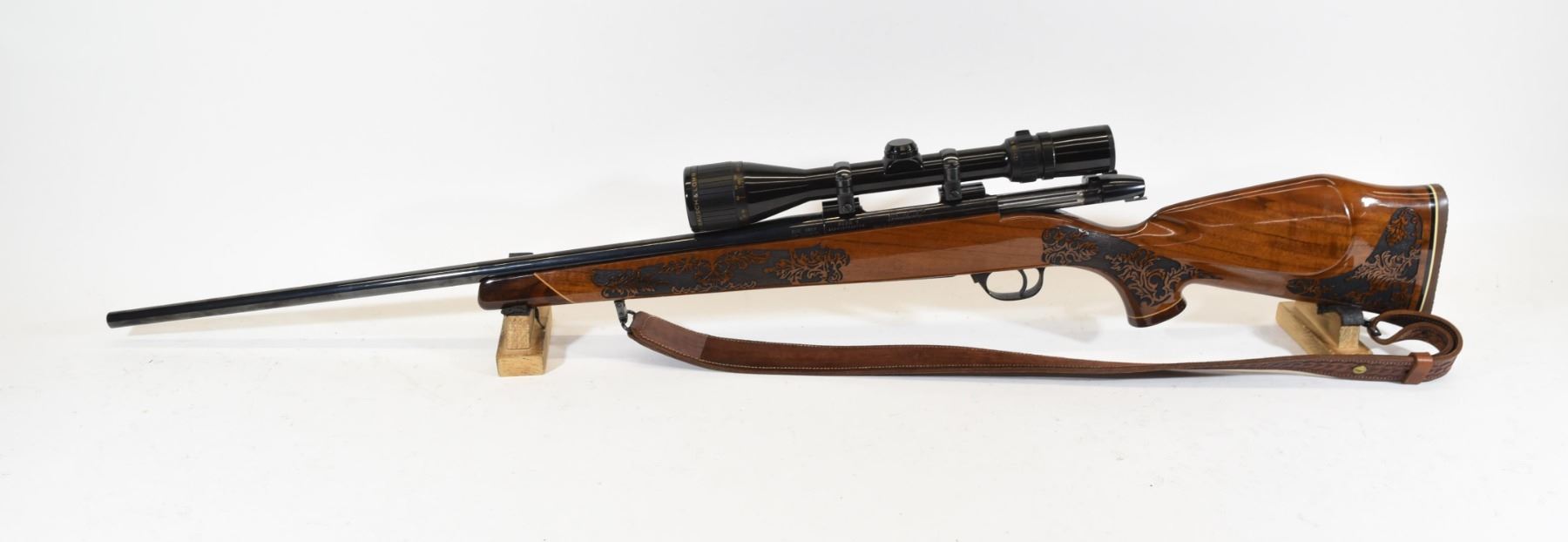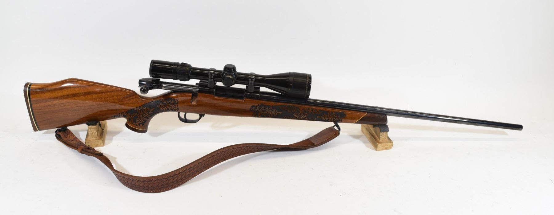 Non-restricted, 22-250Rem, bolt action, SN S06365. Wood stock is in excellent condition. Bluing has a few very small marks, but is in very good condition overall. Bore is excellent. Rifle has a Bausch & Lomb 4-12x40 scope mounted and a leather shoulder sling.