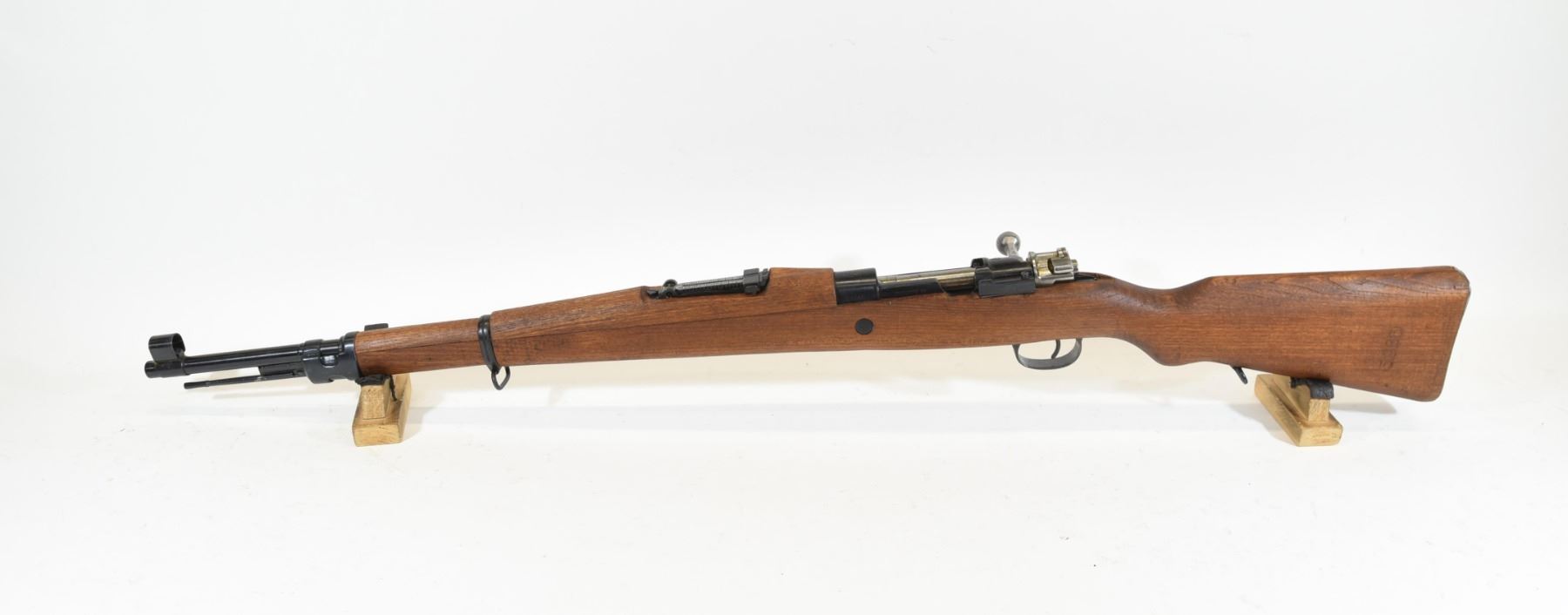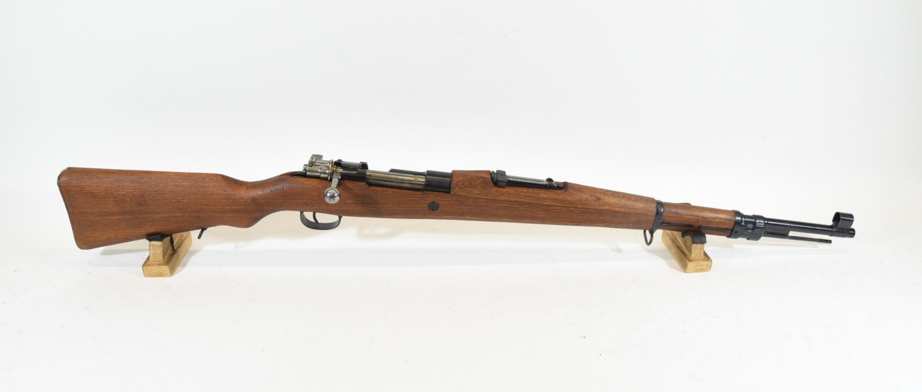 Non-restricted, 8mm Mauser, bolt action, SN J5986. Wood stock is good. Bluing has two scratches on the barrel, but is good otherwise. Bore is excellent. All serial numbers are matching.