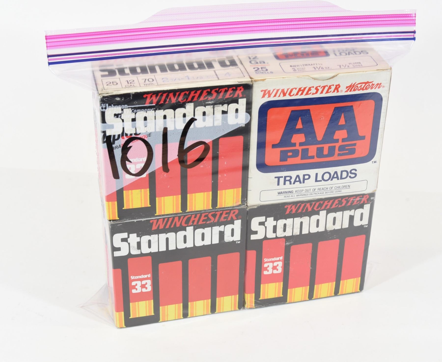 Three 25-round boxes Winchester Standard 12ga 2 3/4" #4. 25-round box of mixed Winchester 12ga ammo labeled Winchester Western AA Plus 12ga 2 3/4" #7.5.
