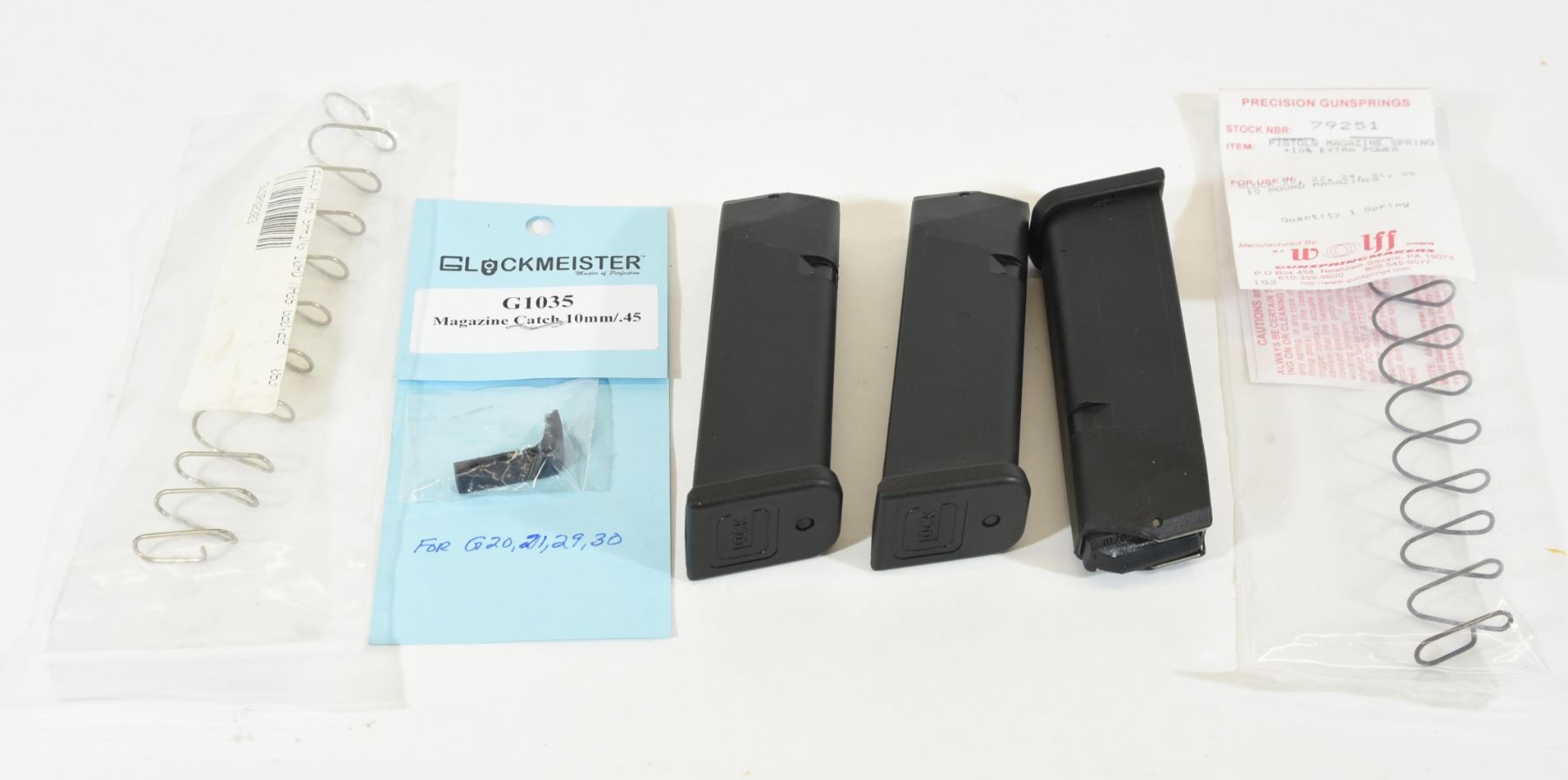 1) 3 factory 10-round Glock 22 magazines 2) 2 magazine springs 3) Factory-style magazine catch.