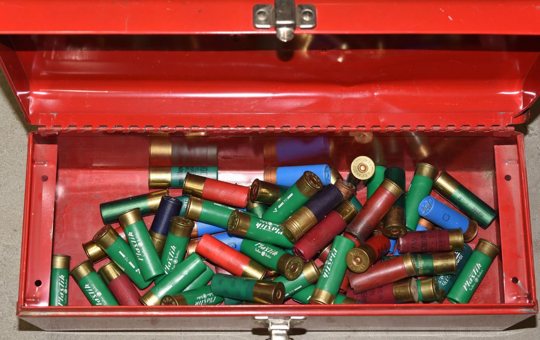 Tool box with 64 rounds of mixed 12ga ammunition.